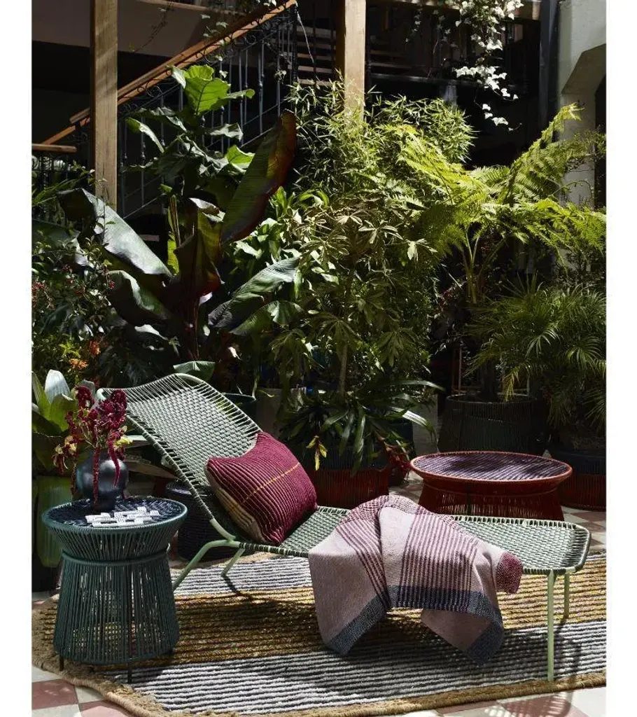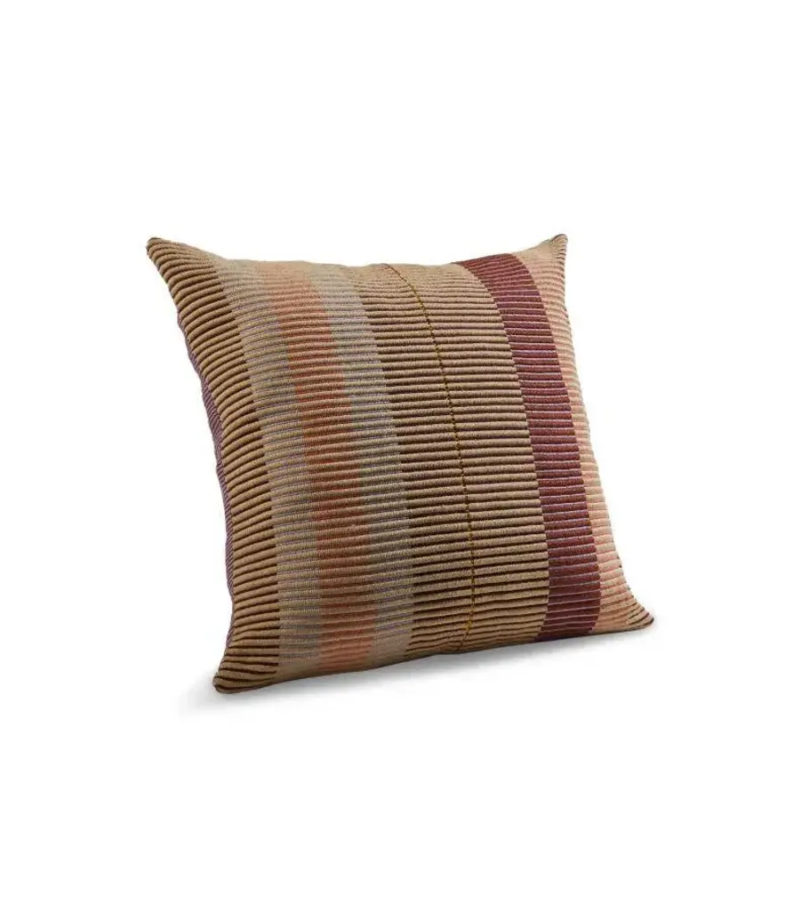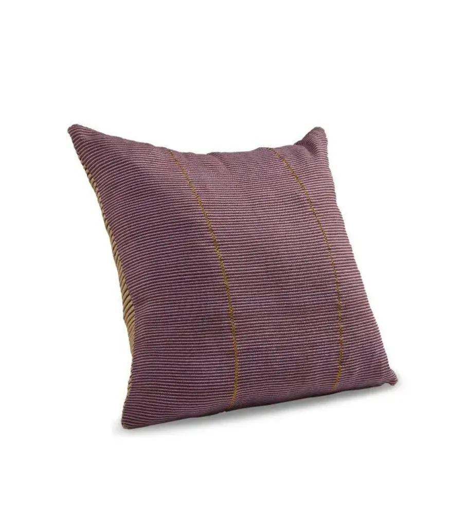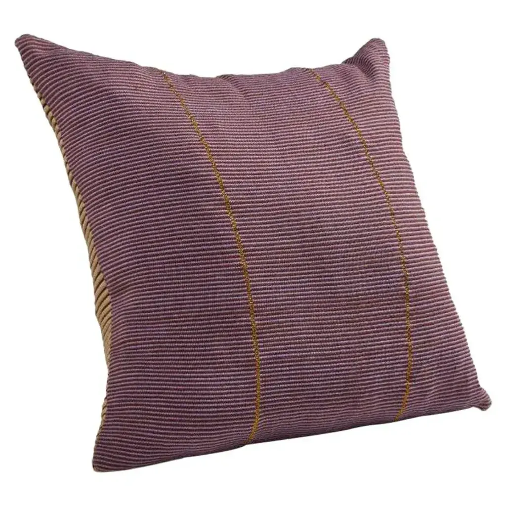 Chumbes pillow 2 by Mae Engelgeer. Materials: 100% Cotton. Technique: Hand-woven in Colombia. Dimensions: W 80 x H 80 cm Available in colors: Lila/ brick/ gold/ terra. Also available in sizes: Small, Large, and Cylinder Pillow. The Chumbes Cushion is a sumptuous accessory created by Dutch textile designer Mae Engelgeer. A lively addition to any sofa or lounge chair, its very intricate stripe pattern is inspired by the Chumbe Inga, a traditional Colombian garment. The cushion features two different hand-woven motifs that have a ribbed structure, making it a joy to touch. Thanks to the metallic threads that have been woven into the cotton, the cushion has a gentle lustrous shine.