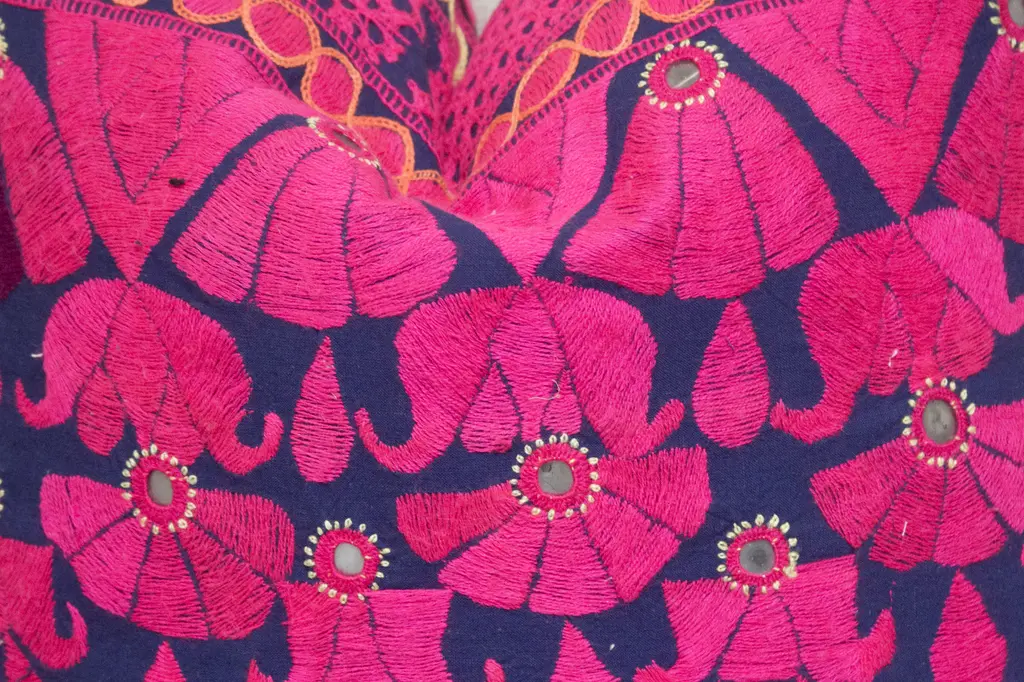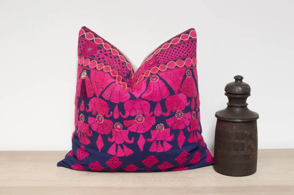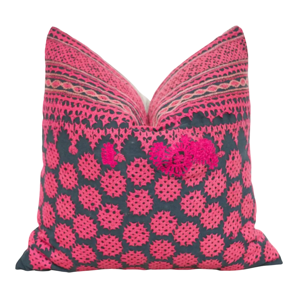 A lovely hand-embroidered pillow made from vibrant vintage tribal skirts coupled with a new linen back. This intricate lace-like and floral embroidered cotton pillow is the perfect splash of color to add to any space. This throw pillow has a hidden zipper and comes filled with a down-blend insert. For care and maintenance, remove the insert and dry clean only.
