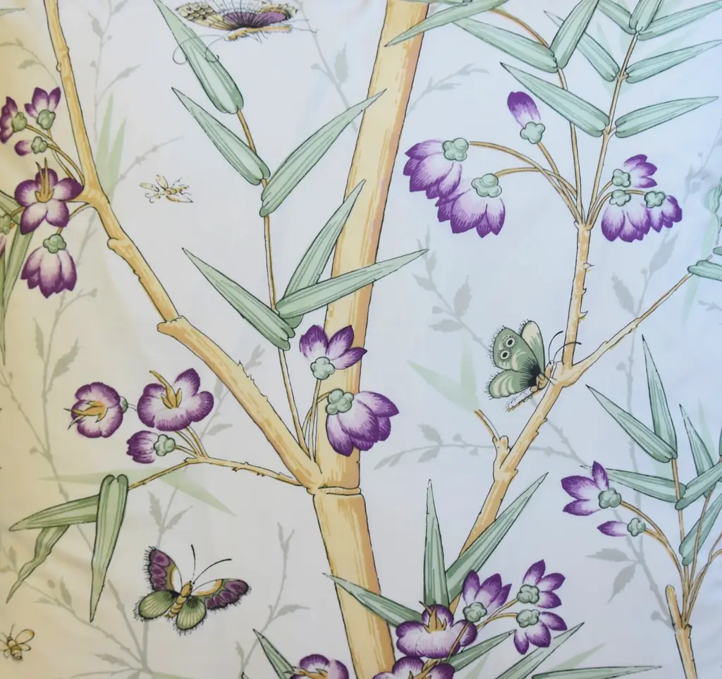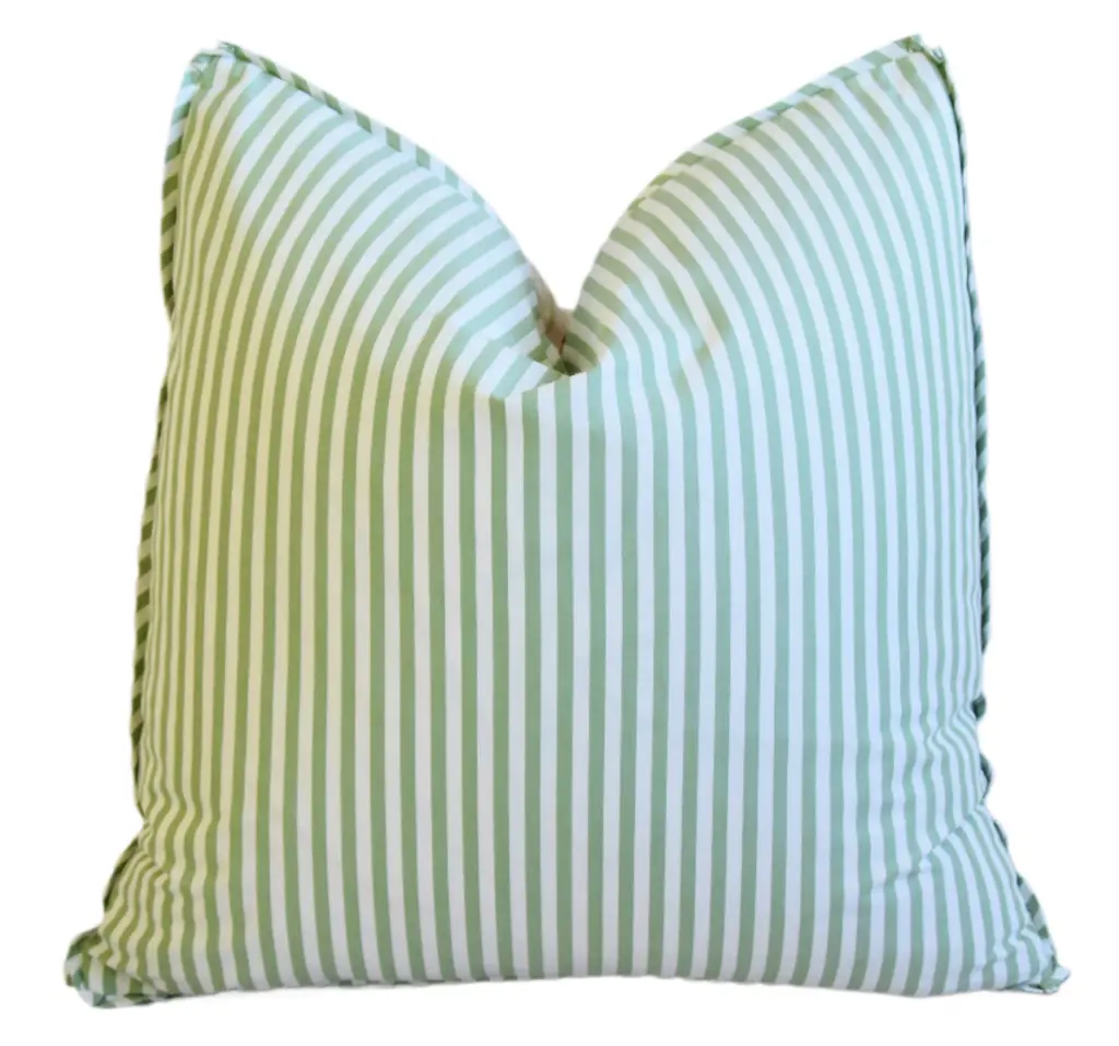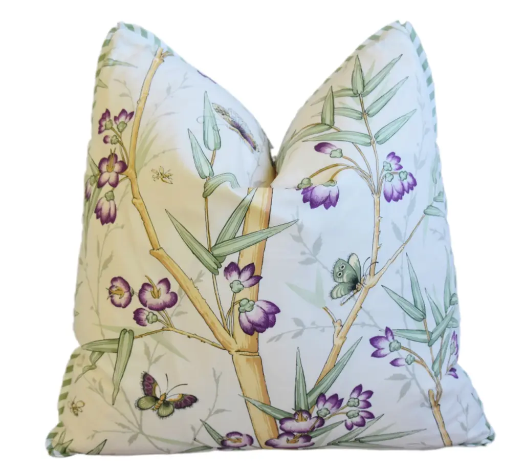 Custom-tailored pillow in designer Clarence House "Bambous Fleuris" cotton fabric. Green and white stripe cotton fabric backs called "Blaise Prairie" from Colfax and Fowler. Custom-tailored striped pinched corner flange fabric trim, zipper closures, and new generous goose down-and-feather inserts. Excellent new, unused condition.