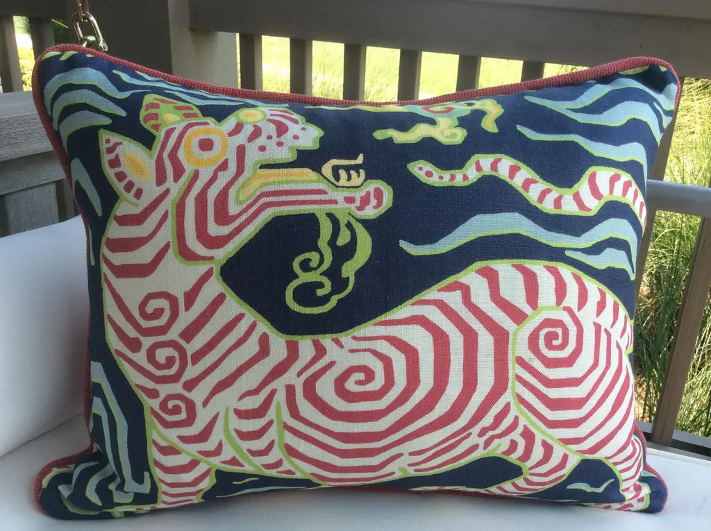 Fabulous printed linen from Clarence House. Tibet Dragon in celadon is a printed linen featuring a stylized dragon on a deep navy background. There are accent colors of hot pink and green and grass green. Corded and backed in a coordinating pink linen, and closed by way of invisible zipper, these are such scene stealers. Generous down insert included. Pillow insert included. This listing is a single pillow.