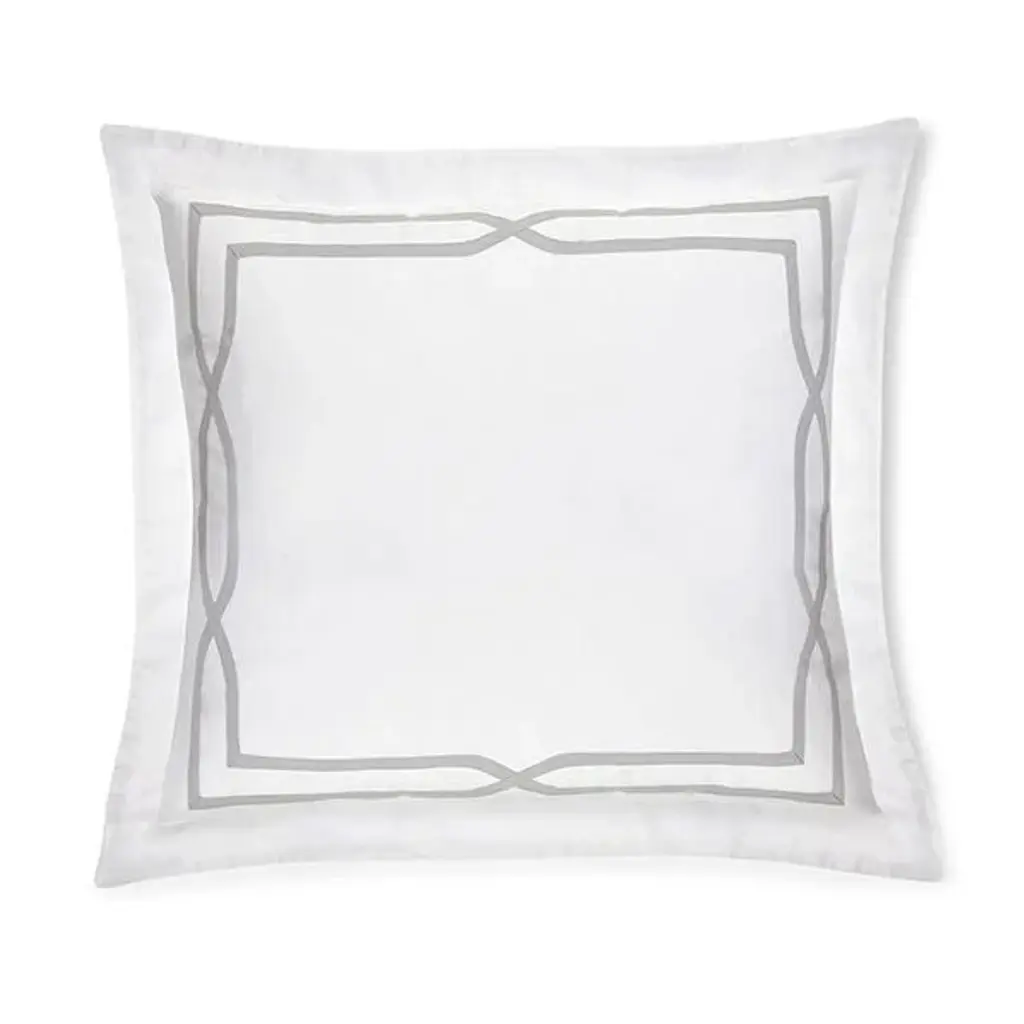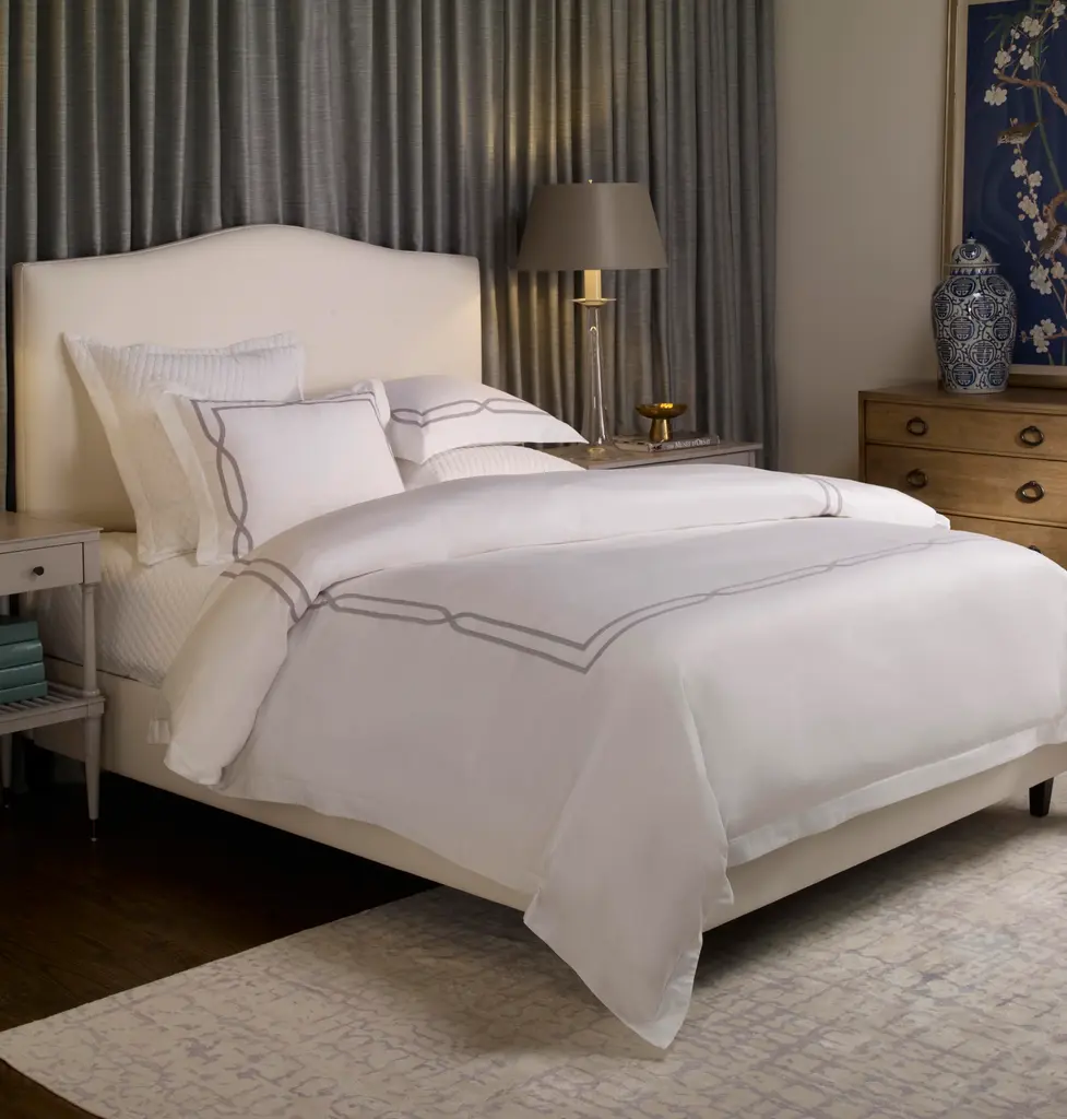 A new classic and serene applique. 1/2" cotton bias tape is used to create the beautiful Clarissa design (approx 2" wide) on luxurious 500 thread count cotton sateen.