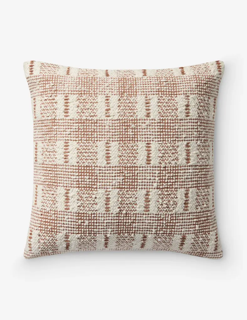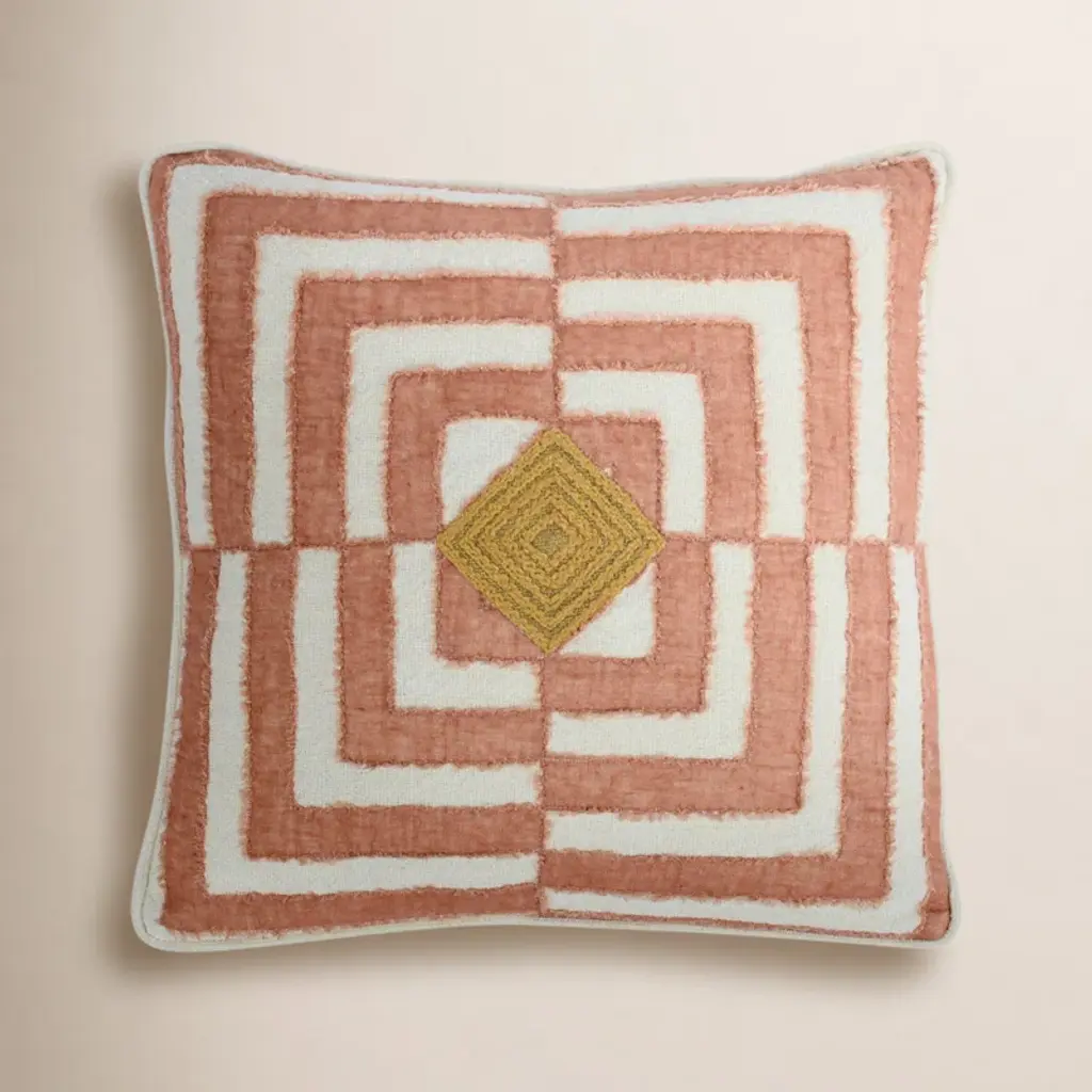 With an abstract blush and ivory geometric motif, this pillow is hand-embellished with a sheer linen applique and intricate embroidery. The Clarita brings a posh yet charming look to an accent chair or sofa and adds a unique contemporary flair to your space. This pillow is a cotton and linen blend with a down feather blend insert.