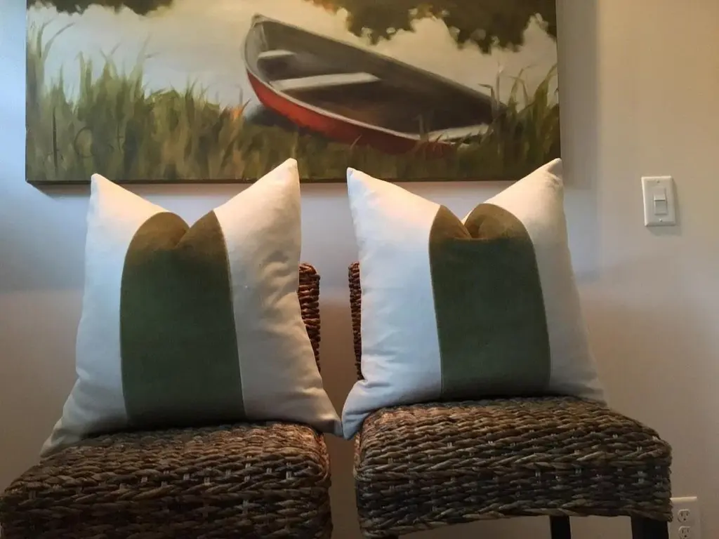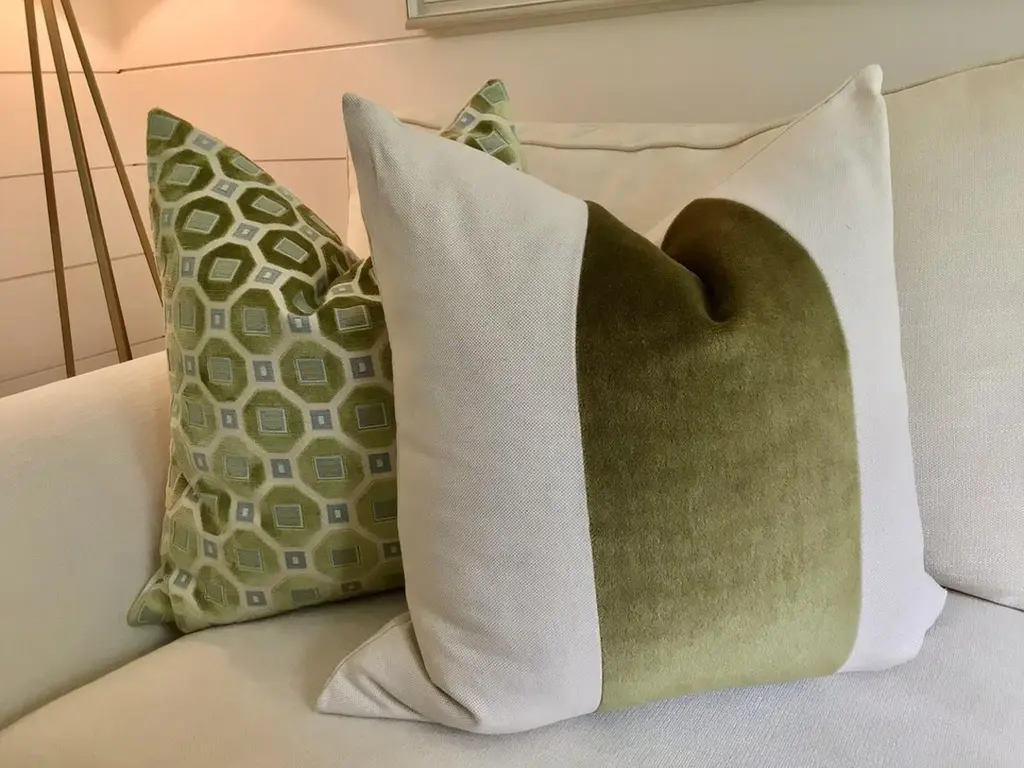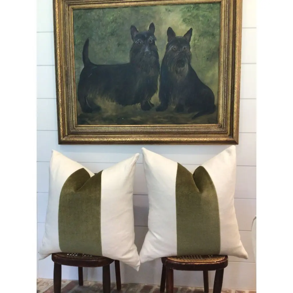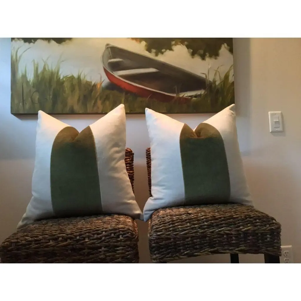 So sophisticated and stunning. My workroom wizards have taken lovely woven linen in an oatmeal tone and added a wonderfully stunning dark green mohair velvet stripe down the center. The backing is the same supple oatmeal linen and closure is by way of invisible zip.Subtle elegance. Beautiful high-quality linen and velvet meet for a clean modern pillow...Understated glam!The listing is sold as a 22" pair of pillows (2 total) with plush down inserts included. Professional dry-cleaning recommended.About UsAt Accent Marks, each designer pillow is crafted with care using the finest hand-selected fabrics and trims, paired with durable, discreet invisible zippers. We specialize in creating beautiful, high-quality pieces that elevate your home decor. While most of our listings feature 22" pillow pairs, we also offer a range of sizes and single pillow options to suit your needs. All of our Accent Marks pillows are proudly made in the United States.If you don't see the fabric you're searching for, please reach out via message as we have other fabrics available upon request and can create anything that you like. Thank you for visiting Accent Marks!