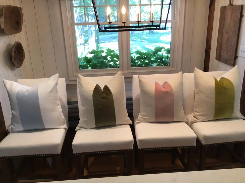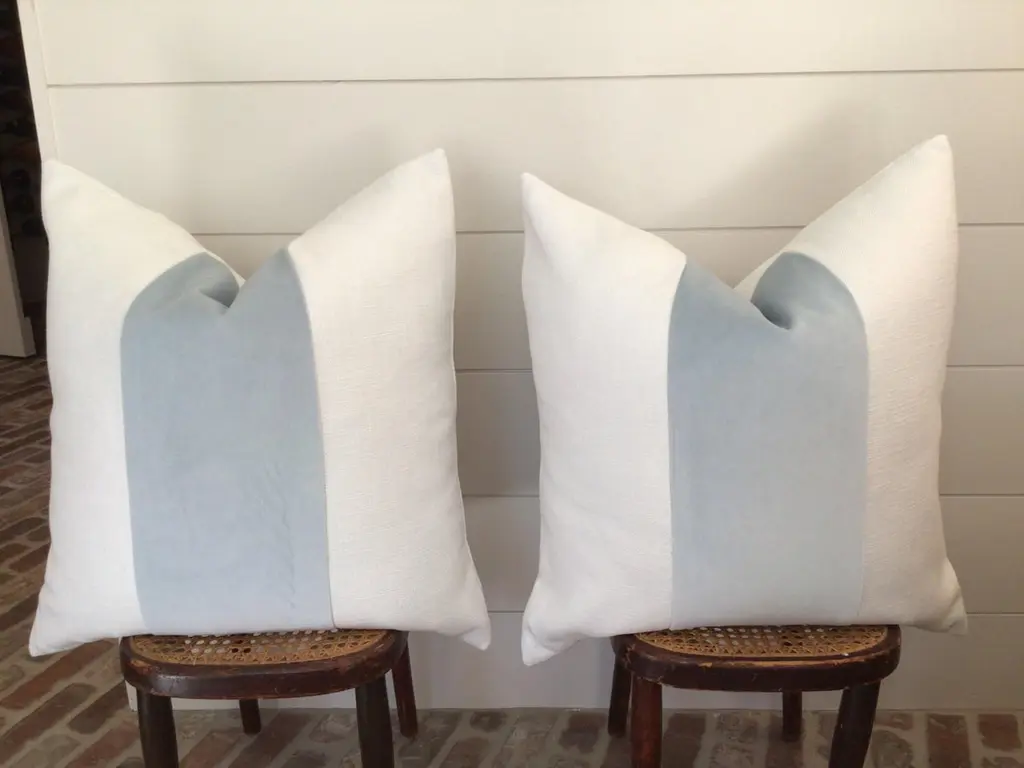 So sophisticated and stunning. My workroom wizards have taken lovely woven linen in an oatmeal tone and added a stunning baby blue velvet stripe down the center. The backing is the same supple oatmeal linen and closure is by way of invisible zip.Subtle elegance. Beautiful high-quality linen and velvet meet for a clean modern pillow...Understated glam!The listing is sold as a 22" pair of pillows (2 total) with plush down inserts included. Professional dry-cleaning recommended.About UsAt Accent Marks, each designer pillow is crafted with care using the finest hand-selected fabrics and trims, paired with durable, discreet invisible zippers. We specialize in creating beautiful, high-quality pieces that elevate your home decor. While most of our listings feature 22" pillow pairs, we also offer a range of sizes and single pillow options to suit your needs. All of our Accent Marks pillows are proudly made in the United States.If you don't see the fabric you're searching for, please reach out via message as we have other fabrics available upon request and can create anything that you like. Thank you for visiting Accent Marks!