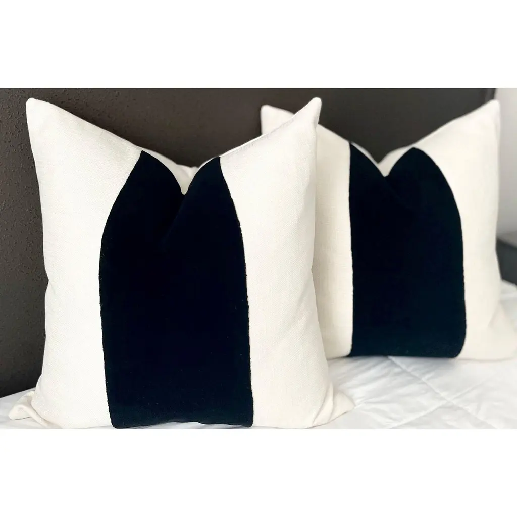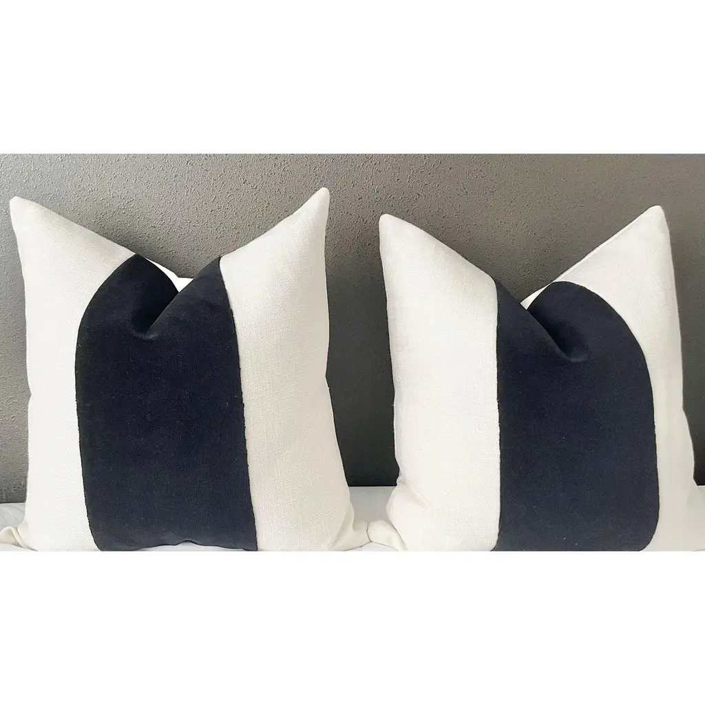 So sophisticated and stunning. My workroom wizards have taken lovely woven linen in an oatmeal tone and added a Jet Black velvet stripe down the center. Subtle elegance. Beautiful high-quality linen and velvet meet for a clean modern pillow...Understated glam! The backing is the same supple oatmeal linen and closure is by way of invisible zip. The listing is sold as a 22" pair of pillows (2 total) with plush down inserts included. Professional dry-cleaning recommended.About UsAt Accent Marks, each designer pillow is crafted with care using the finest hand-selected fabrics and trims, paired with durable, discreet invisible zippers. We specialize in creating beautiful, high-quality pieces that elevate your home decor. While most of our listings feature 22" pillow pairs, we also offer a range of sizes and single pillow options to suit your needs. All of our Accent Marks pillows are proudly made in the United States.If you don't see the fabric you're searching for, please reach out via message as we have other fabrics available upon request and can create anything that you like. Thank you for visiting Accent Marks!
