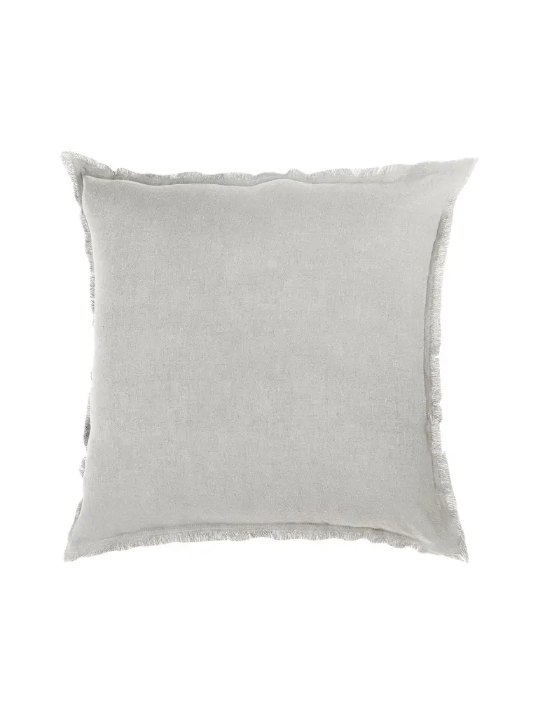 The Fringe Soft Linen Pillow is Soo soft- you won’t believe it's linen! This yarn has a slight nub which gives it a beautiful natural texture. Edges have a self-fringe on all sides. Sizes: 14"x20", 20"x20", 26"x26". Details Front & Back Color: Cloud Grey Front & Back side: 100% Linen (Pre-washed) Concealed zipper closure on back side. Spot Clean. Hang to Dry. Imported. Pillows are available in 3 options:Pillow Cover Only, with a Down Alternative insert, or with a Down InsertDown Alternative InsertBenefits: Allergen free, Better back support, Retain their shapeInside Fill: 1.2 denier x1.25" polyester gelOuter Shell: 65% polyester/ 35% white cotton blendMade in the USA Down InsertBenefits: Durable, Easy to fluff and re-style, Retains heatInside Fill: 95% gray duck feathers and 5% goose downOuter Shell: 233-thread count 100% cotton fabric Made in the USA