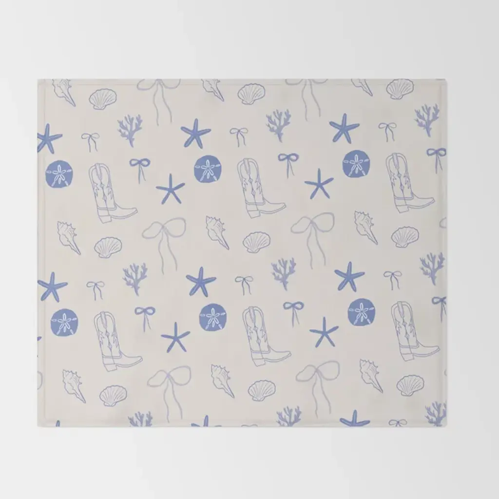 Coastal Cowgirl | Beachy Blue Seashells & Boots Throw Blanket