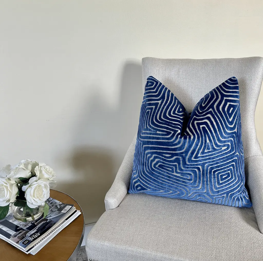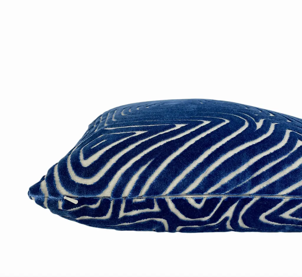 Add vibrancy to your decor with this luxurious bold cobalt blue velvet pillow. The cut velvet maze pattern is set on a cream rayon background that provides ample texture. It has a touch of sheen that adds an element of sophistication. It's made of thick velvet fabric that's durable and useable. Mix and match it will with other rich colors for a vibrant look. All pillow covers are slightly tapered at the corners to prevent doggy pointy ears. When stuffed, the pillow will have a perfect square shape. Made to order in the USA. This pillow comes stuffed with a Feather down insert. Fabric: Velvet Stuffing: 95/5 Feather Down Insert Care: Dry Clean Closure: Nylon zipper closure Made to order Will ship within 5 business days