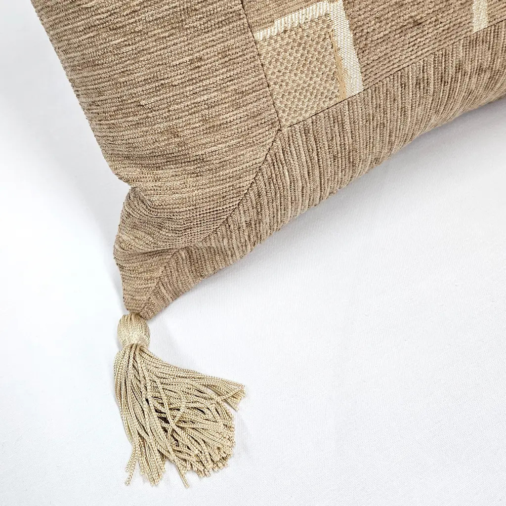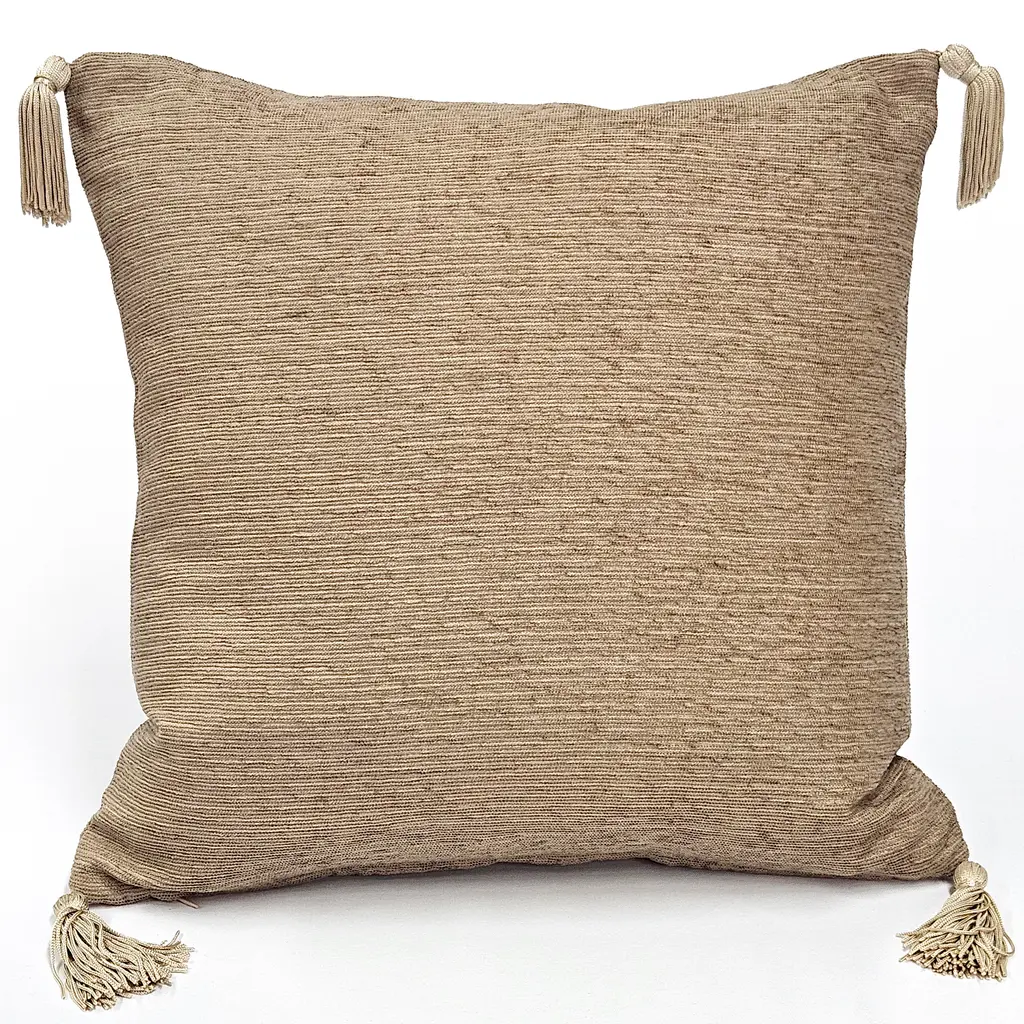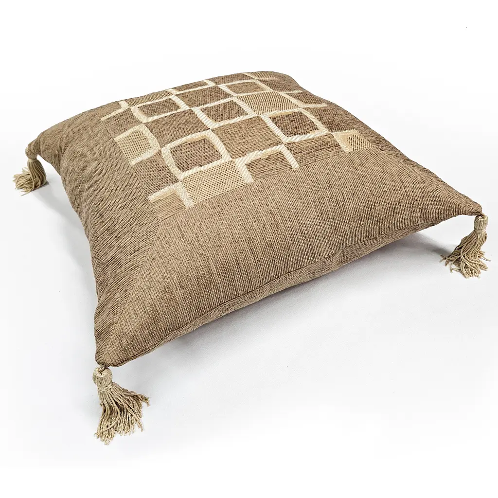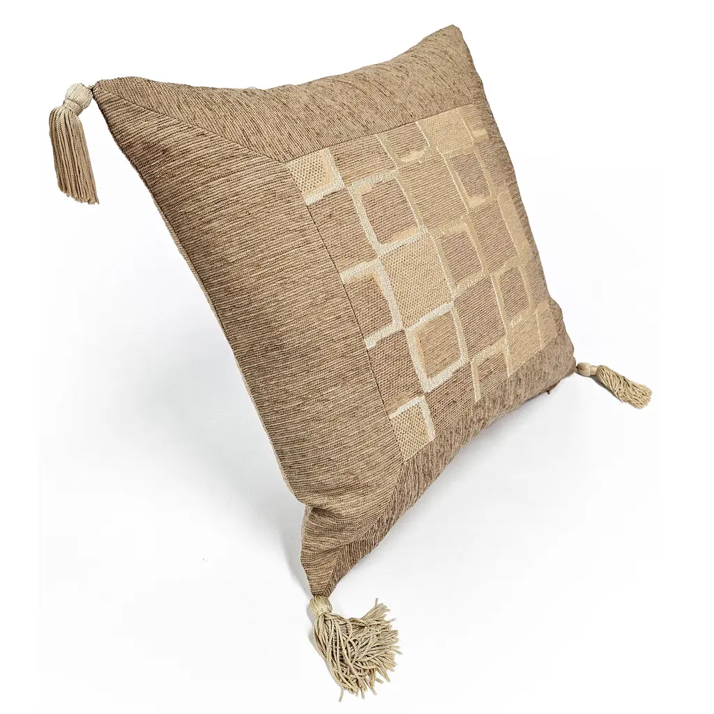 Add a touch of refined texture to your space with the Coffee Cubes Tassel Throw Pillow. Measuring 17 inches, this elegant throw pillow features a rich, dark coffee cream color that creates a warm and inviting feel. The front showcases an intricate cube pattern, bordered with shimmering pale gold stitching that catches the light just right. Tasseled corners add a hint of playfulness while elevating its timeless appeal. Size: 17"x17" Square Fabric: 50% Polyester/30% Acrylic/20% Cotton Cube design on front only. Same solid color fabric on back. Pale gold corner tassels Knife edge seams. Hidden zipper closure in bottom seam of pillow cover Dry Clean Only