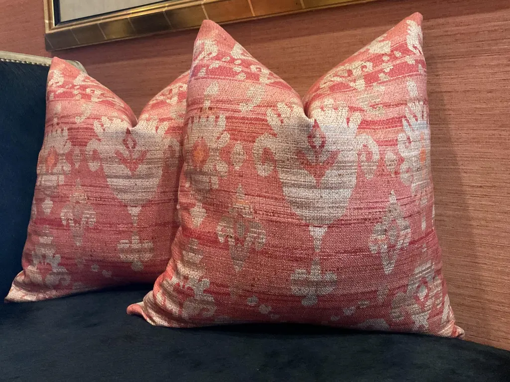 A stunning traditional in a contemporary color! Brunello in red is a lovely linen damask print by Colefax and Fowler for Cowtan and Tout. In lovely deep shades of coral red, pink and taupe, these will work with many color and design schemes! This pattern is reminiscent of a fine Oushak Rug design.These will be backed with a coordinating linen back. Closure by way of an invisible zipper.These will come as a 22" pair with plush down inserts.Pattern placement will vary but will always feature a centered scene.
