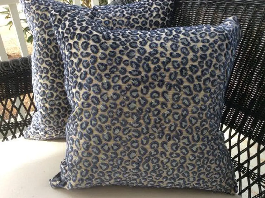 Colefax & Fowler Pillows in "Wilde" Midnight Blue & Ivory Velvet Back Raised Velvet - a Pair Gorgeous leopard spot velvet in midnight blue on an ivory background! From high end "To The Trade" design house-Colefax and Fowler- comes this plush raised velvet fabric that has been fashioned into pillow covers, backed in soft ivory velvet and closed by invisible zipper. With a retail price approaching 300/yard, these extravagant and beautiful pillows can be yours for a song! ABOUT ACCENT MARKS PRODUCTS: Each pillow cover is handmade with the highest quality fabrics and zippered for easy access. These pillows measure 22"x22" and include down inserts. This listing is for a pair of pillows.