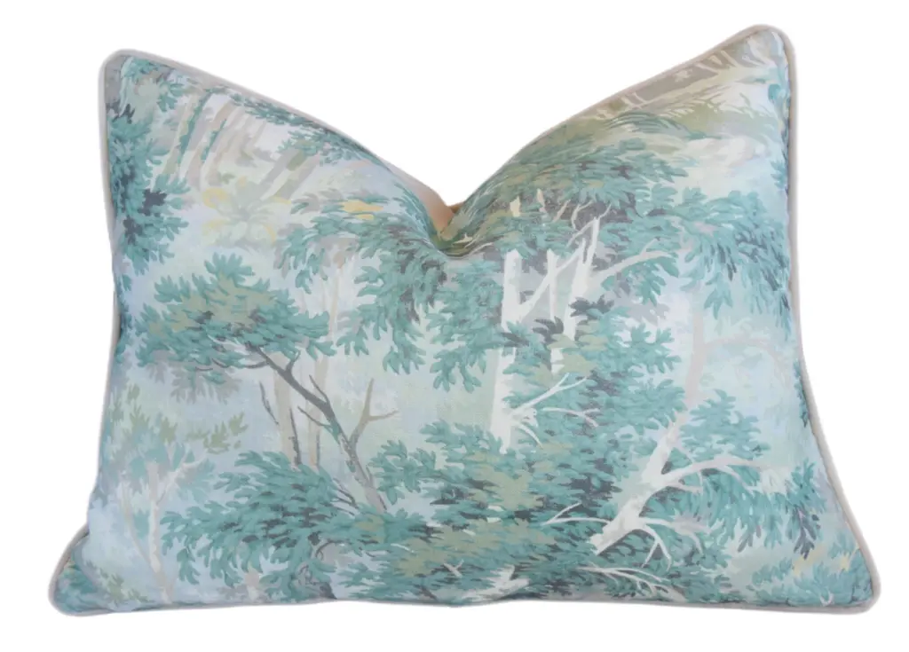 Custom-tailored designer pillow by Mike Seratt of The Prized Pig in Colfax & Fowler linen fabric called "Arden" depicting a beautiful old-world tapestry floral design. Cream cotton-velvet fabric back. Custom-tailored cord trim. Zipper closure. Plump goose down-and-feather insert. Pattern placement may vary according to the fabric cut. Excellent new unused perfect condition!!