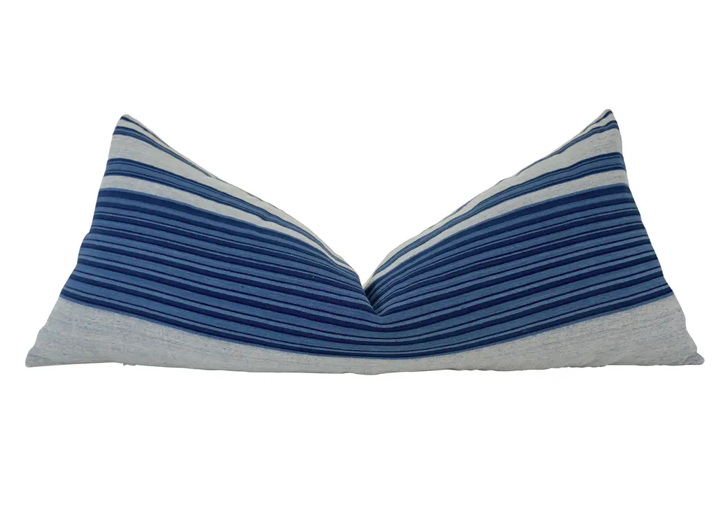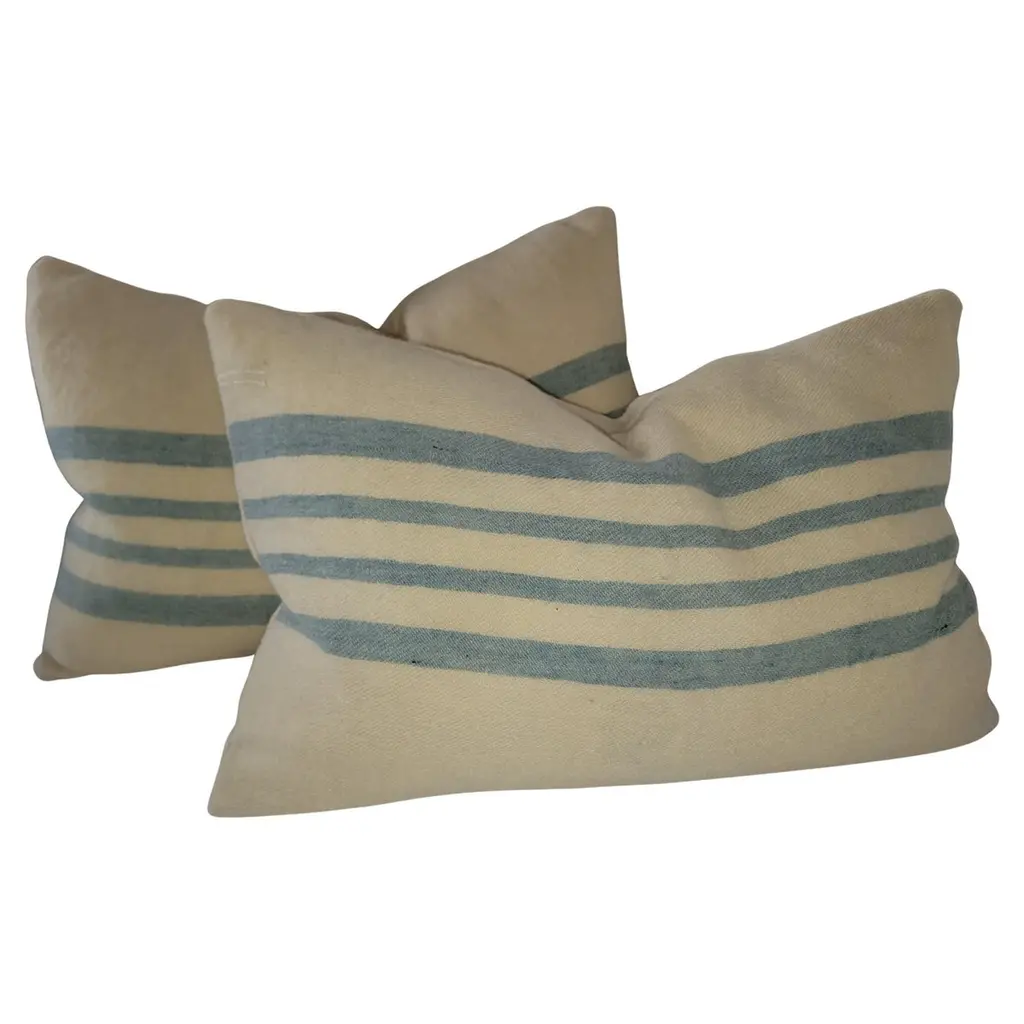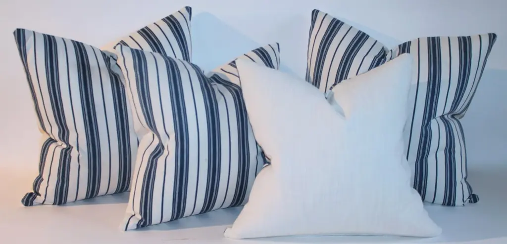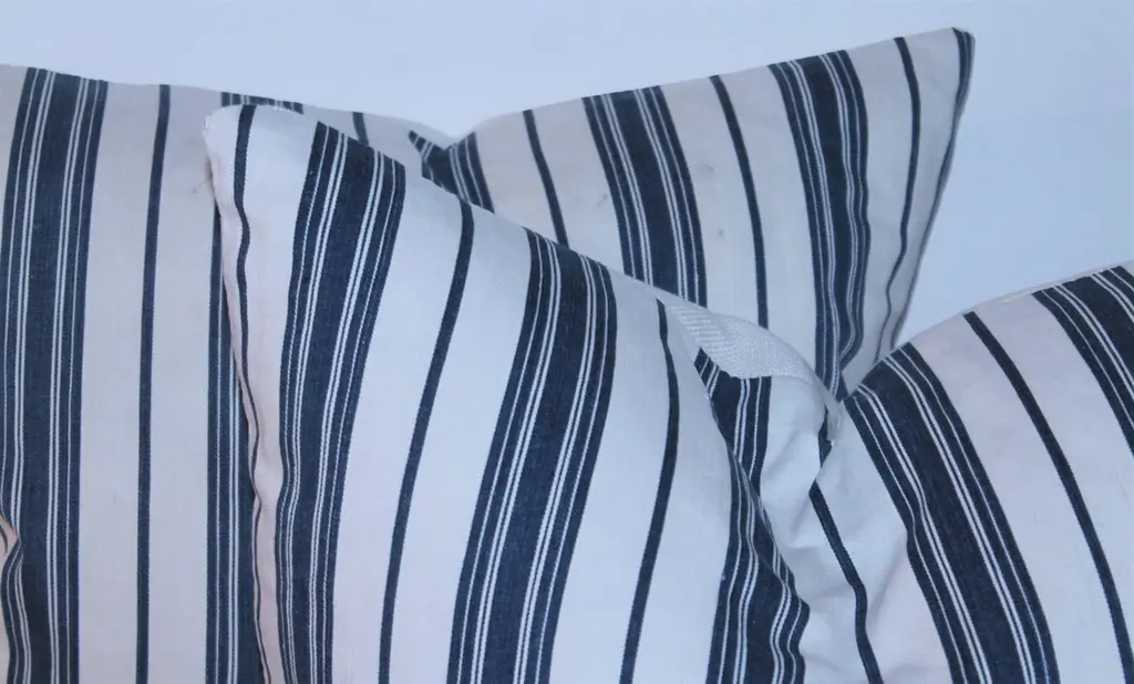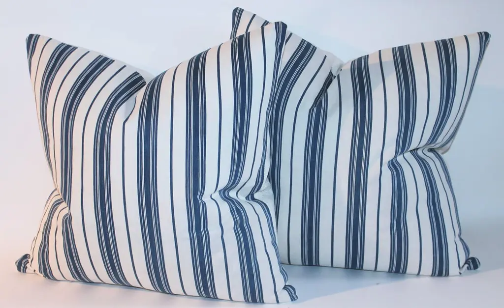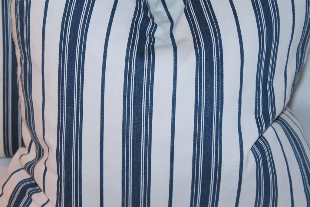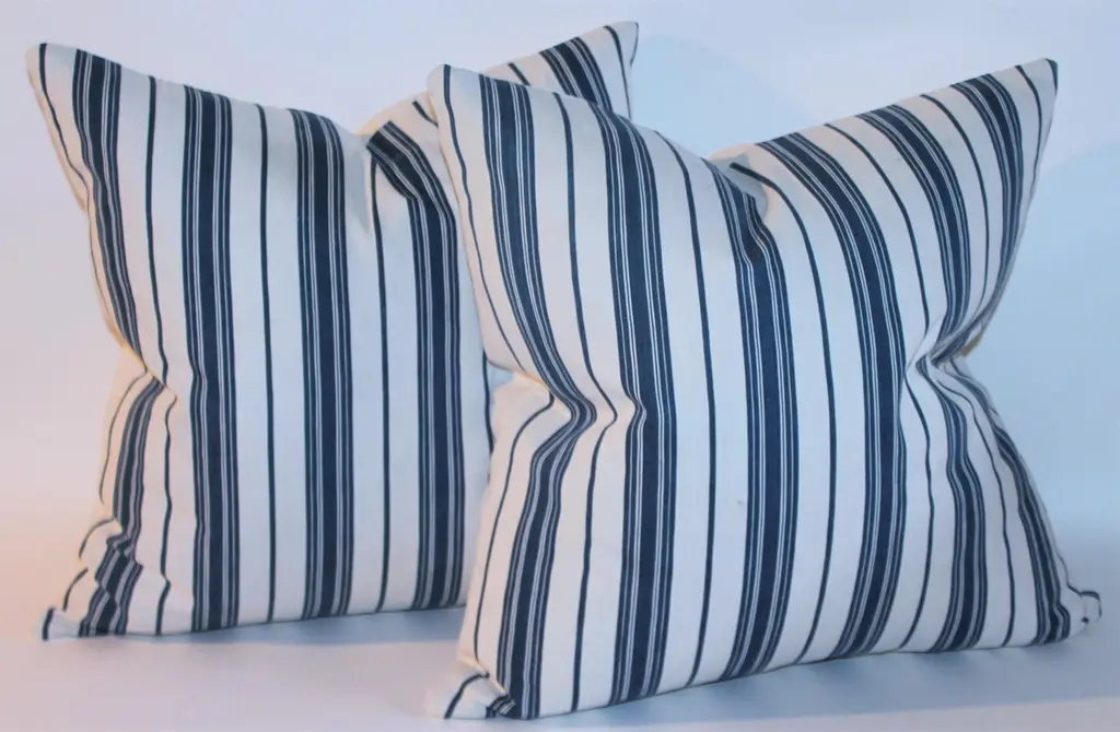 19thc blue & white ticking pillows with white linen backing. There are two pairs 20 x 20 and 22x22.Pair of 22 x 22 pair of 20 x 20.