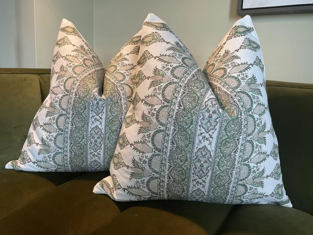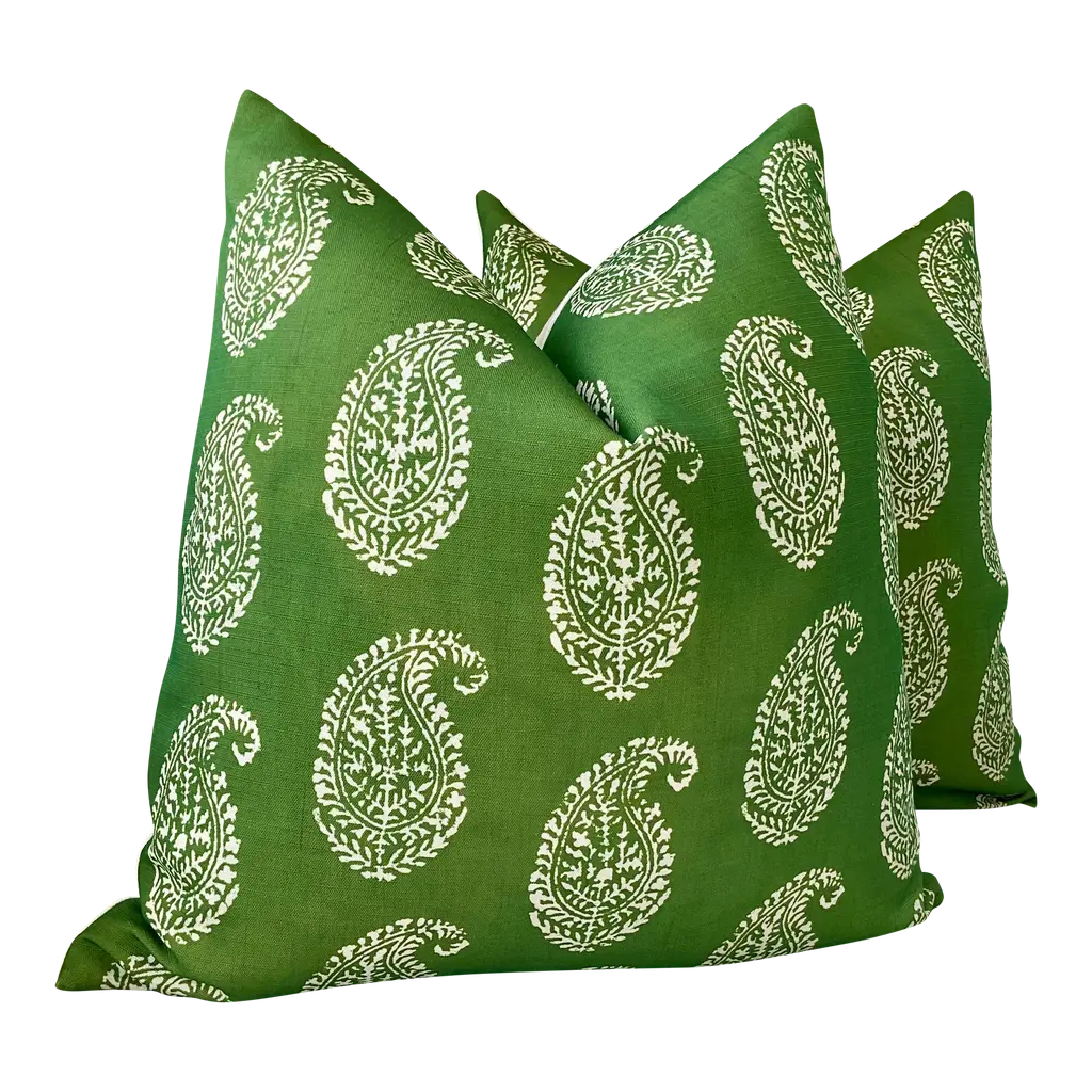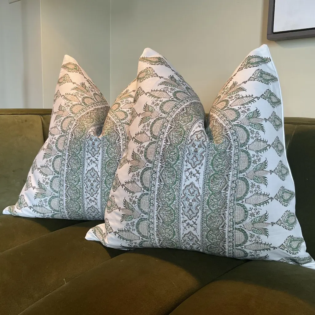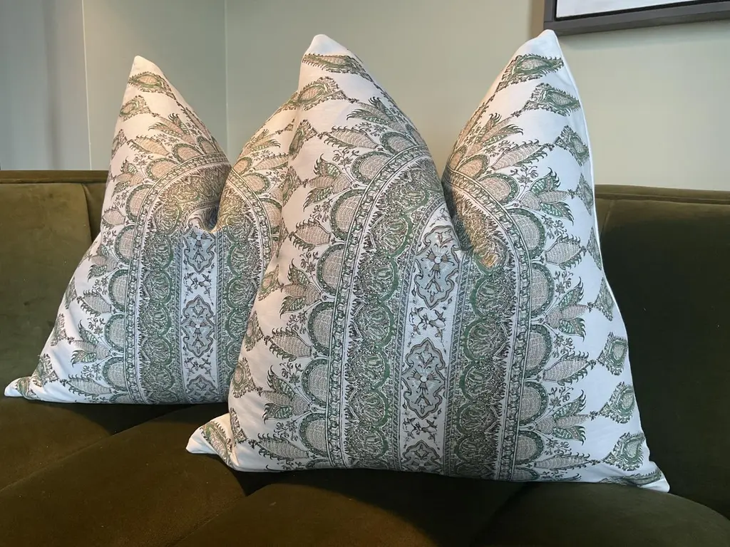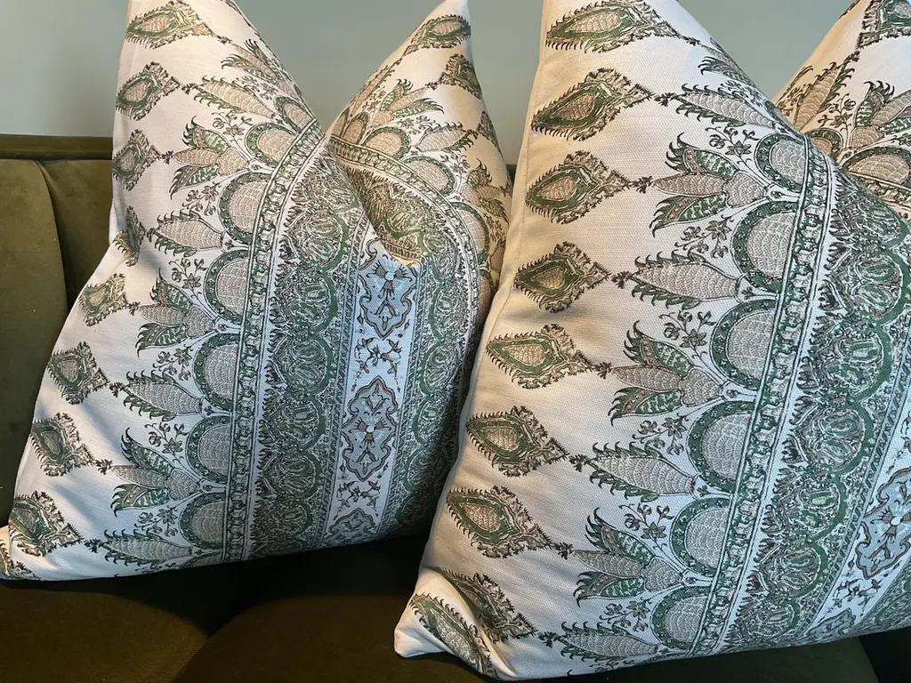 Transform your decor with Akola Stripe in Green from Thibaut’s distinguished Indienne collection. This is more than fabric — it’s a striking fusion of heritage charm and contemporary elegance, ready to become the focal point in any room.What Makes It SpecialDesign Inspiration & Pattern: Inspired by antique Palampore designs, the Akola Stripe pattern is a dramatic take on traditional hand‑block borders. By mirror‑imaging the border, Thibaut has created a bold, large‑scale stripe that’s both graphic and graceful.These will come as a 22" pair with plush down inserts.