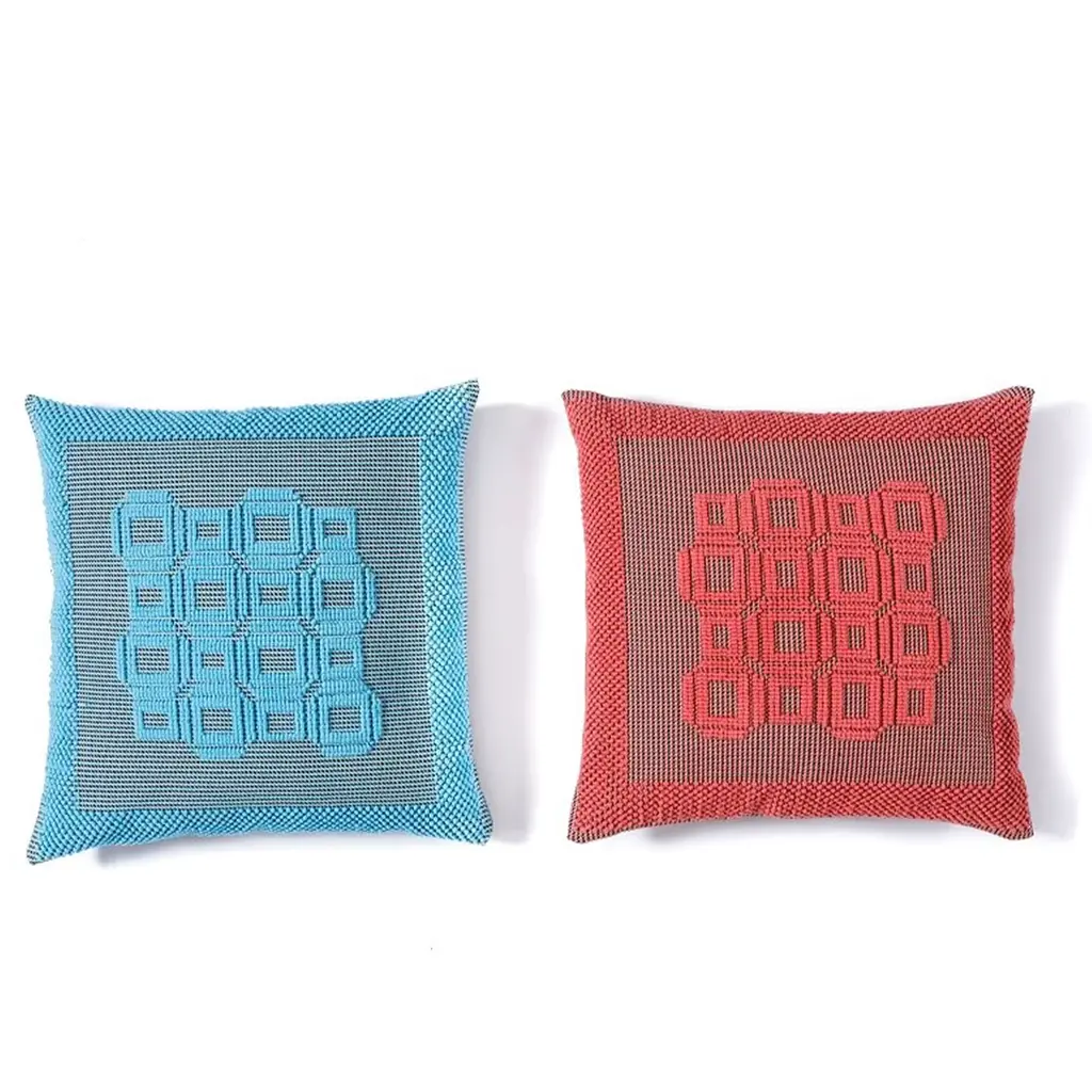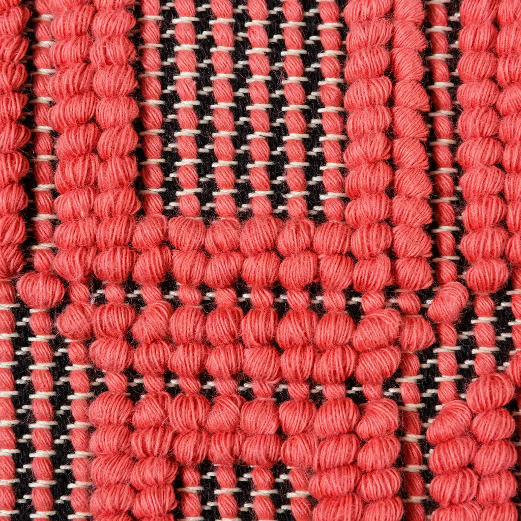 Perfect to bring a dash of color to neutral-toned homes, this refined cotton cushion is marked by a special weft obtained as a result of the "pibiones" (the Sardinian word for grapes) technique, named after the playful, grape-like shape of the stitches. A combination of black and red threads characterizes the background, enlivened by a captivating geometric pattern contoured by a matching design along the borders.
