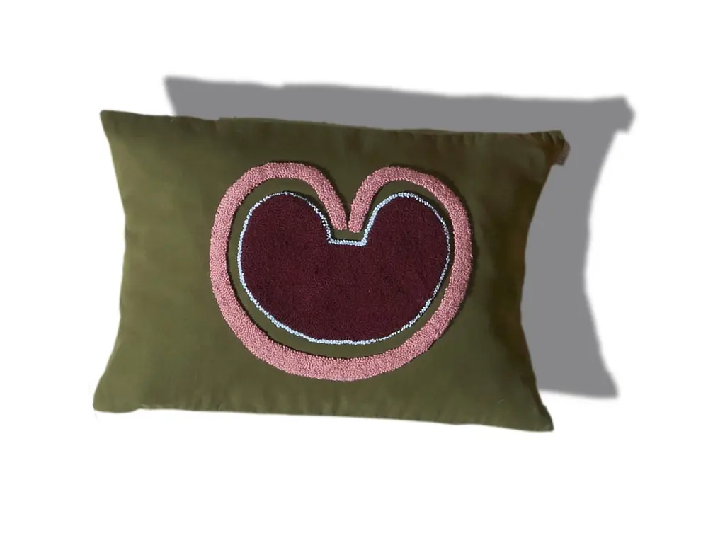 Coraz 2 Nido cushion by Sebastian HerknerMaterials: 100% cotton. Technique: Hand-woven in Colombia. Dimensions: W 60 x H 40 cm Available in colors: salmon/yellow, olive/pink, mostaza/terracotta. The Nido Coraz Cushion combines joyful colours with intriguing hand-crocheted motifs. Its cotton cover is decorated with a fluffy, heart-shaped macramé detail, making the cushion an eyecatcher on any sofa or lounge chair. Sebastian Herkner designed the Nido collection after a visit to Bogota’s Museo del Oro, the gold museum, where he discovered Colombia’s ancient jewelry. The color combinations are inspired by the hummingbirds Sebastian saw in the Reserva Entreaguas. Overall, the Nido cushion collection includes five motifs, available in various vibrant color shades. Each cushion is made by hand in small workshops in Columbia’s Reserva Enteragua region. The people living in this area of the Andes have kept the old crocheting techniques alive. Just the preparation of the cotton and wool takes up to three days, while the artesanos and artesanas – as the craftsmen and women are known in Colombia – need five days to make one cushion. German designer Sebastian Herkner is a long-term collaborator of Ames and has visited Colombia multiple times to experience the country’s cities, nature and people first hand. He also visited many of the ateliers that Ames has partnered with to learn about the unique traditional crafts of Colombia's regions. A sought-after contemporary designer and recipient of many industry awards, he has worked with many international design brands, creating intriguing pieces that showcase his intuition for interesting material, color, and texture combinations.