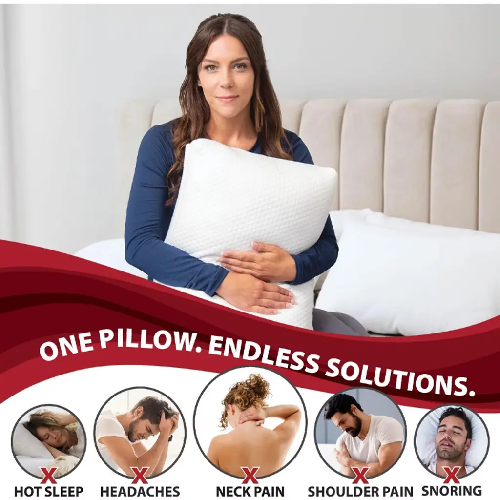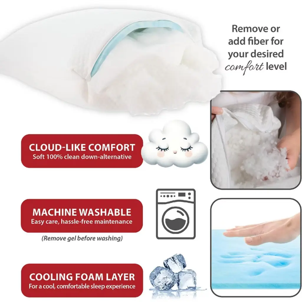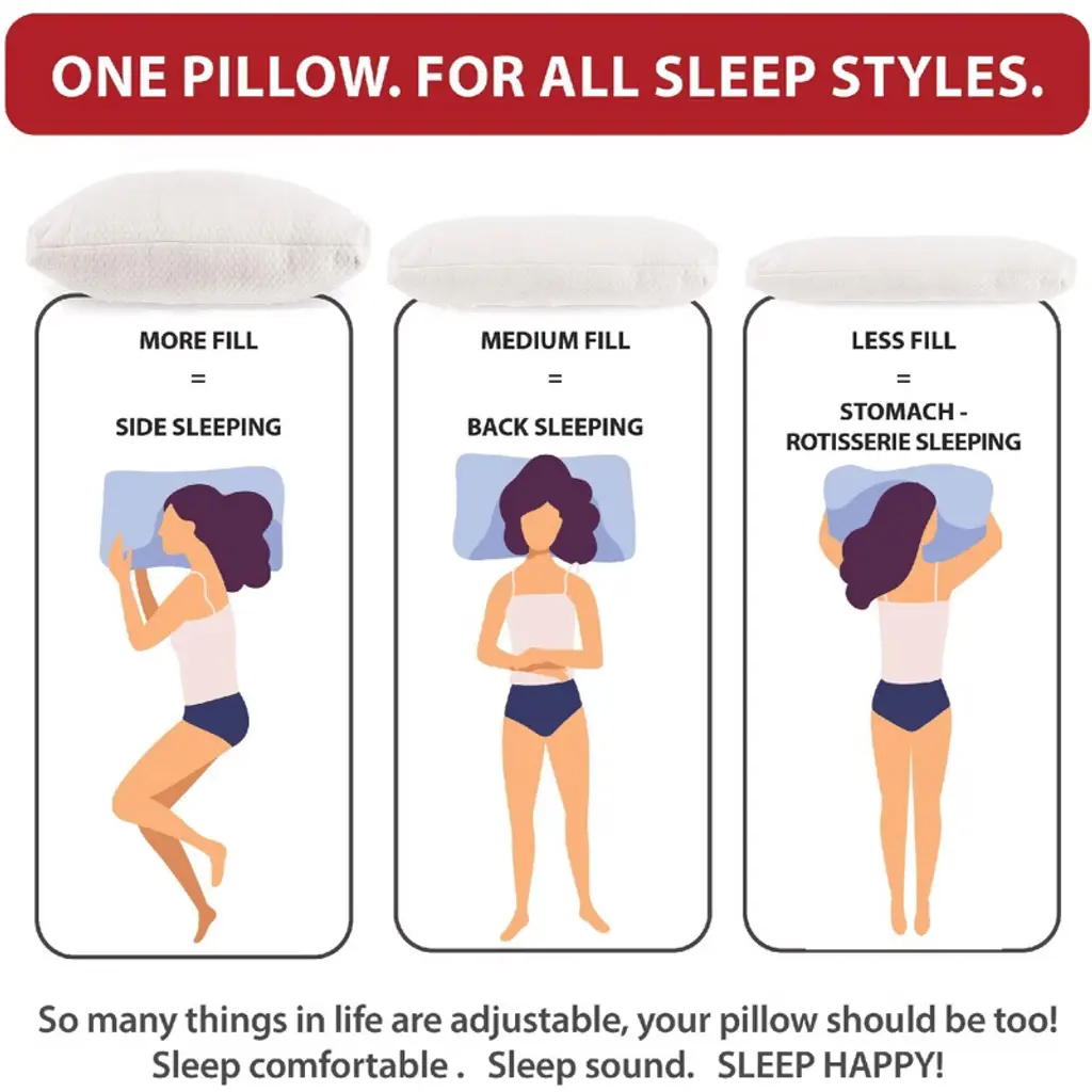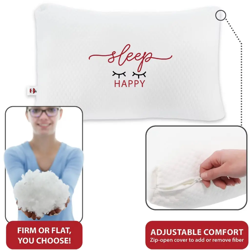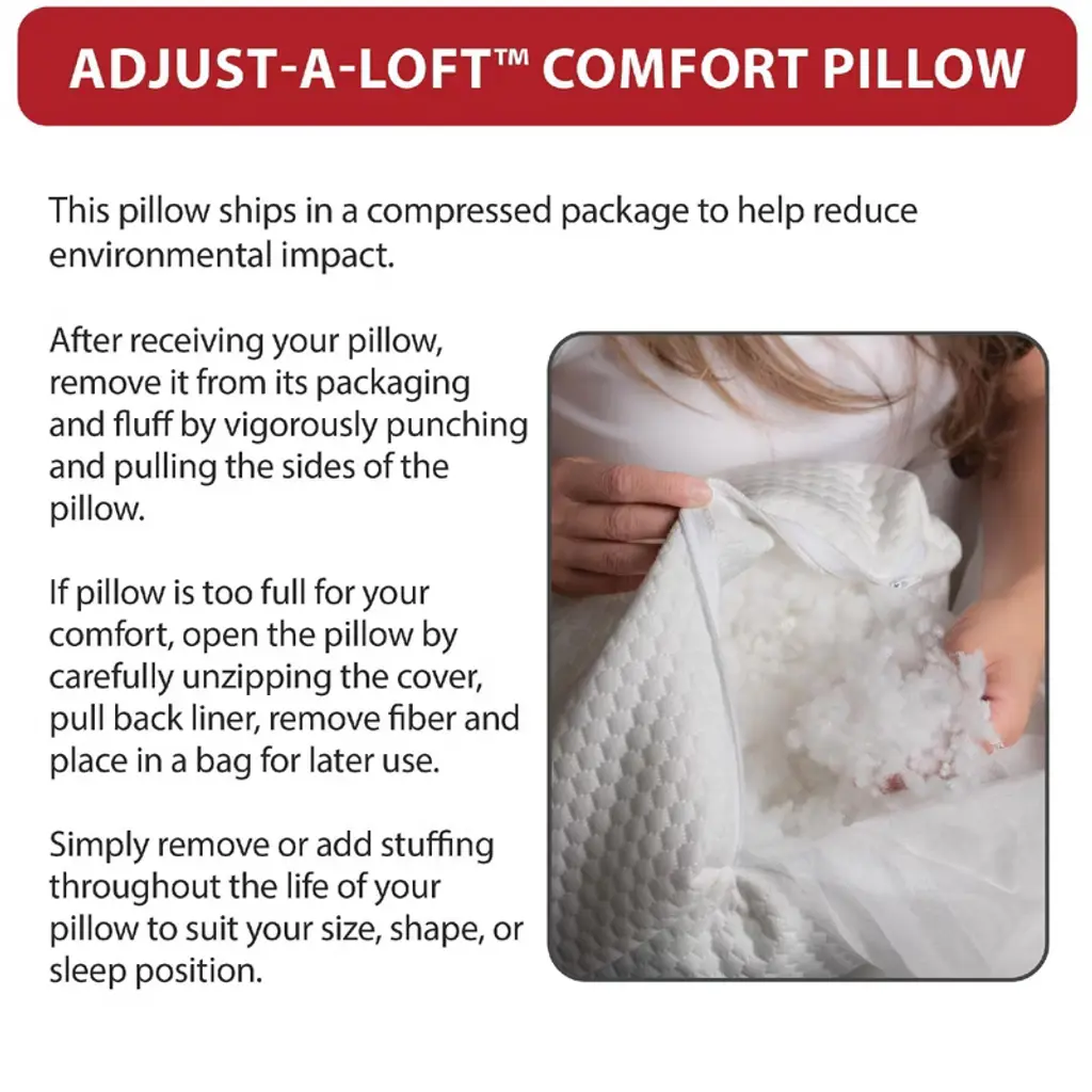 Your Perfect Pillow, Your Way! Why settle for a pillow that's too soft or too firm? With the Adjust-A-Loft Pillow, you’re in control. Arriving overstuffed, simply unzip the soft-touch cover and remove as much filling as you need for your perfect level of comfort and support. Cloud-Like Comfort with Down-Alternative Fill Enjoy the plush feel of luxurious, down-alternative fiber - silky-soft and breathable, yet supportive enough to cradle your head and neck night after night. Ideal for sensitive sleepers! Cooler Sleep, Better Rest A cooling gel memory foam layer helps regulate temperature, making this pillow perfect for hot sleepers, keeping you cool and comfortable. Wake up refreshed, not overheated. One Pillow. Every Sleeper. Stomach sleeper? Back sleeper? Side sleeper? Adjust the fill to match your sleep style. Less fill for stomach sleepers, medium for back sleepers, and extra for side sleepers - it’s that simple. Supportive, Resilient & Easy to Care For Our unique cluster fiberfill resists lumping and bounces back when fluffed. Plus, it's machine washable for easy care and long-lasting comfort. (Don't forget to remove the cooling gel memory foam layer before washing!) Thoughtfully Designed Premium, zippered cover for easy adjustment Inner liner keeps fiberfill contained Latex-free and proudly made in the USA Sleep comfortable. Sleep sound. SLEEP HAPPY!
