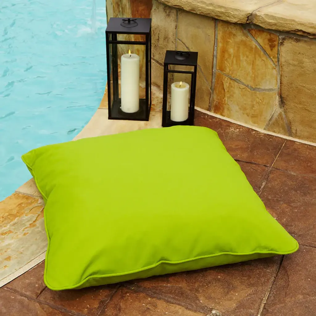 Whether you want to spruce up your outdoor oasis or accent your home decor, our square floor pillow has you covered! Durable Sunbrella Canvas Macaw fabric covers this pillow, adding a soft and fashionable touch to your home, while remaining famously stain, fade and weather resistant. The timeless bright green fabric brings your style together, adding a delightful element to your home. Filled with 100% recycled polyester fiber, this pillow is both a comfortable and stylish addition to your patio or favorite room. TransitionalHigh performance Sunbrella fabric is weather, stain and fade resistant, making it perfect for high traffic areas both indoors and outA striped pattern can bring many design elements together, and adds a tailored touch to your sceneThe flexible design compliments many style settings, ranging from traditional to modernFeatures a sewn closure for easy, no-maintenance style Made in the USA by skilled artisans with a focus on qualityProper care and cleaning of your Sunbrella fabric will help maintain its beauty and longevity. Being 100 percent acrylic, your Sunbrella fabric is easily maintained, and is stain and fade resistant. While being beautiful and soft to the touch, it is perfect for indoor and outdoor high traffic areas. To maintain the beauty of your Sunbrella fabric use a solution of one fourth cup mild soap per gallon of lukewarm water should the fabric become heavily soiled. Brush solution into fabric with soft bristle brush. Rinse thoroughly, removing all soap residue. Allow fabric to air dry.