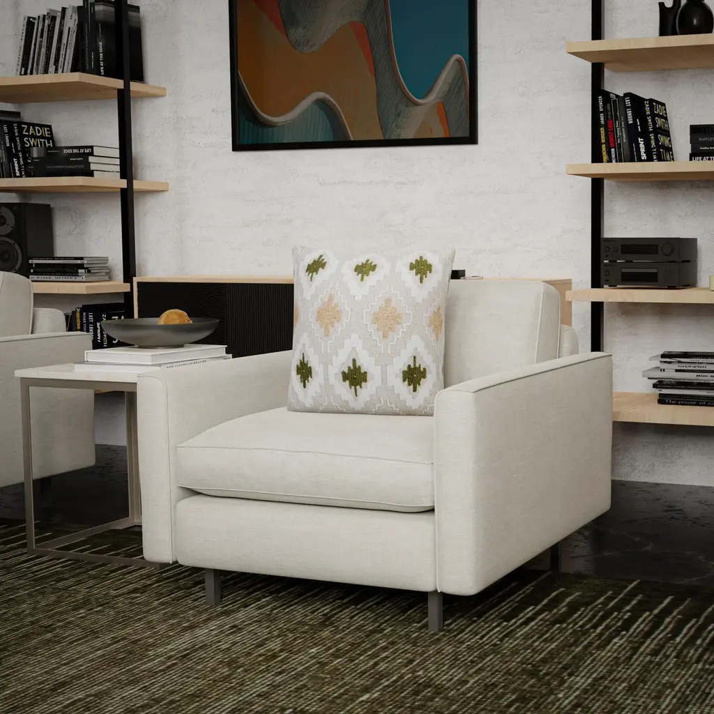 The light texture of this cotton canvas pillow is the perfect background for this wonderfully executed embroidery patterning. Ikat designs in two shades of blue with alternating patterning around the blues in soft ivory on the natural background give this pillow a timeless and classic appeal. Knife edged, this pillow features a coordinating solid cotton back with a hidden zipper closure.