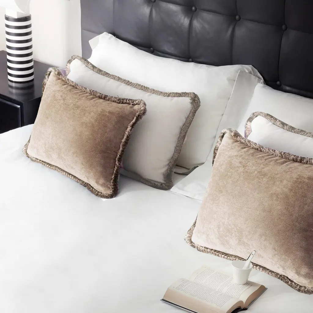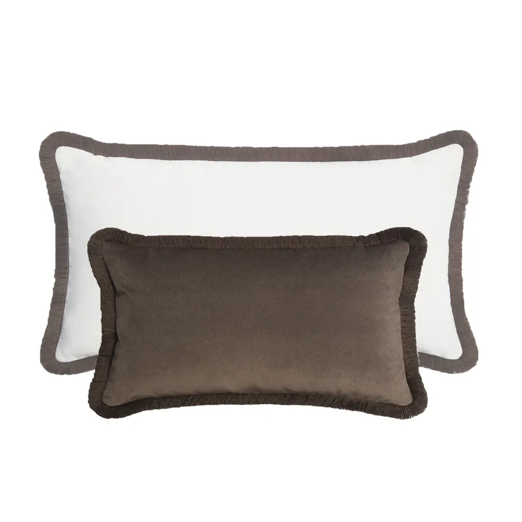 The contrasting chromatic scheme characterizing these couple of cushions lends it a distinct luxe yet restrained allure. It features soft padding in polyester fiber, while its rectangular silhouette is outlined by bold garnet cotton trimming outlining the light-beige velvet upholstery. The possibility to easily remove the cover simplifies its cleaning process. These accent pieces will make an eye-catching addition to a sophisticated living room, study or bedroom. All pieces are marked by simple versatility and charming hues that are easy to mix and match.Handmade in Italy.Sizes: cm 60x35 and cm 45x30Lo Decor is a luxury interior design firm established by Lorenza Briola, noted for its highly sophisticated aesthetic and meticulous production process. Central to the brand is a research and innovation ethos that is evident in all its pillows, from thread and color selection to the final motif design. All pieces are marked by simple versatility and charming hues that are easy to mix and match. Based in Carimate (Como) in Italy, the skills of talented artisans are employed to create cushions that enhance the value of impeccable details. The commitment to excellence involves and characterized Lo Decor.