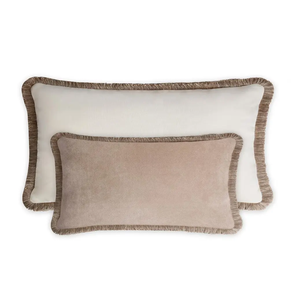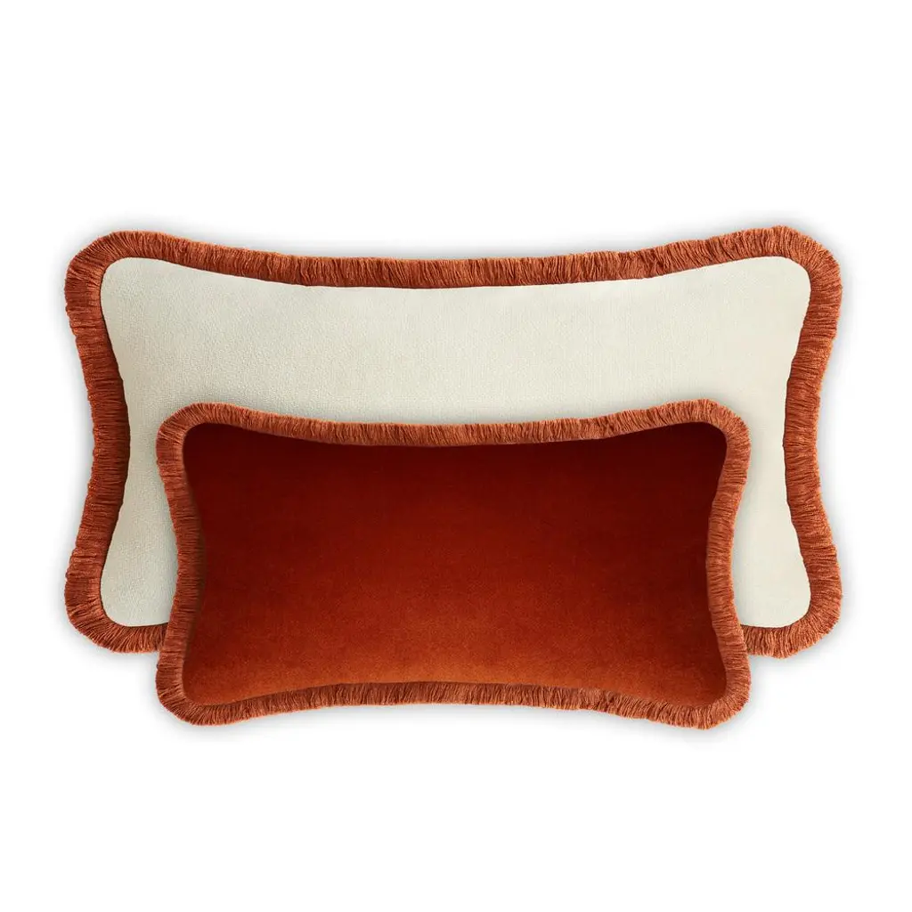 The contrasting chromatic scheme characterizing these couple of cushions lends it a distinct luxe yet restrained allure. It features soft padding in polyester fiber, while its rectangular silhouette is outlined by bold garnet cotton trimming outlining the light-beige velvet upholstery. The possibility to easily remove the cover simplifies its cleaning process. These accent pieces will make an eye-catching addition to a sophisticated living room, study or bedroom. All pieces are marked by simple versatility and charming hues that are easy to mix and match. Handmade in Italy. Size cm. 60x35 and 45x30 Labeled by Maker,Labeled with Country of Origin