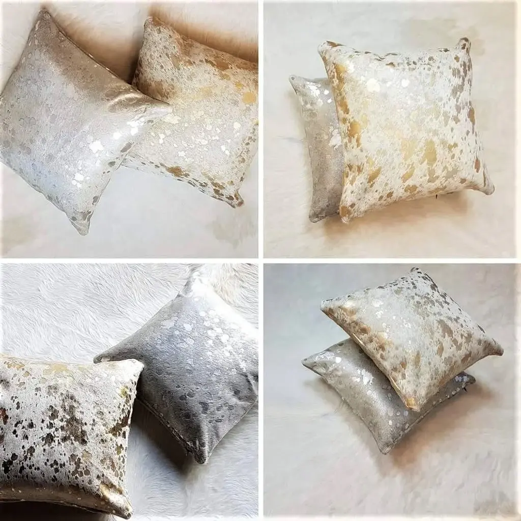 Our acid wash cowhide accent pillows shout rustic elegance! Made of genuine Brazilian hair on cowhide. These cowhide pillow covers are hypo-allergenic and very easy to care for. They only require light vacuuming or just wipe clean.Each pillow is hand sewn in Brazil and made to last a lifetime. Available in Silver and Gold.Details:•Pillow covers measure 15� x 15�.•Available with or without pillow insert.•Zipper closure.•Made of genuine hair on cowhide.•Breed: Brazilian.•Double sided.•.