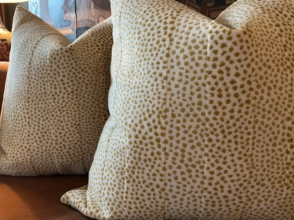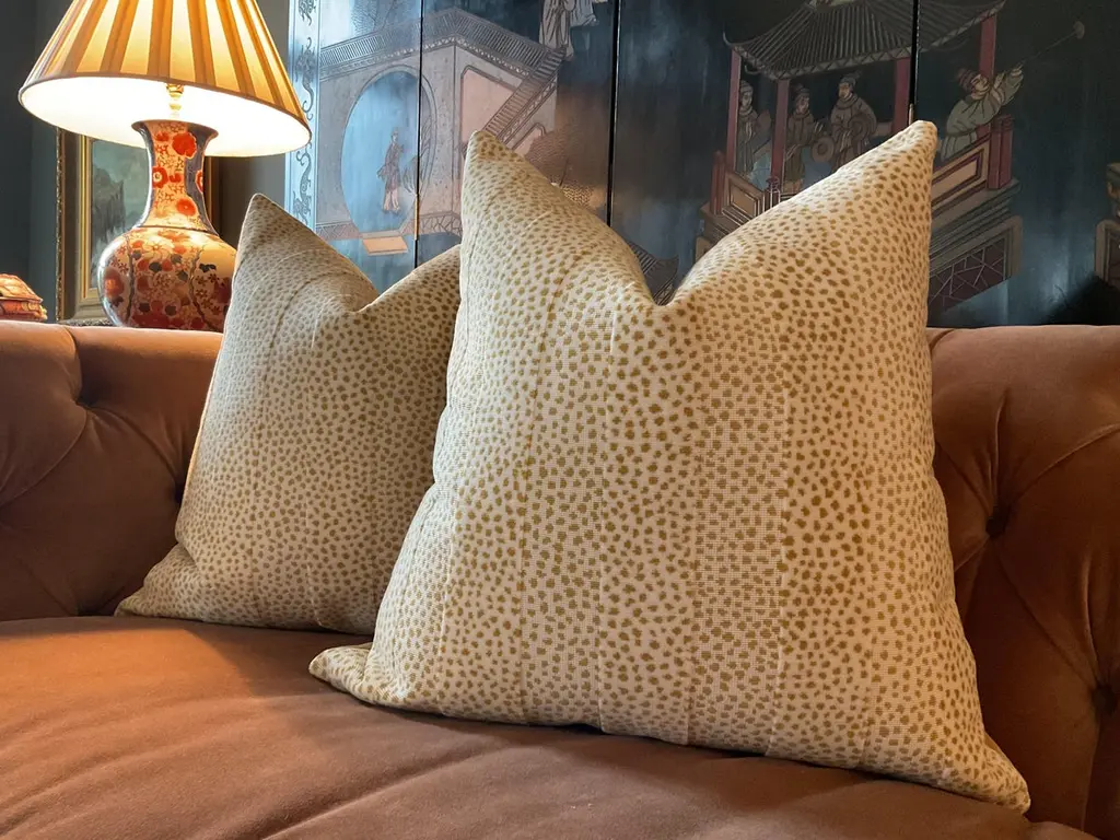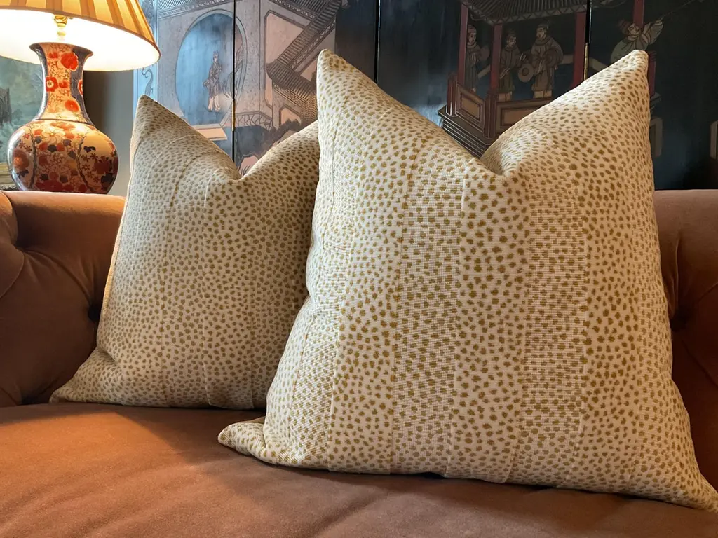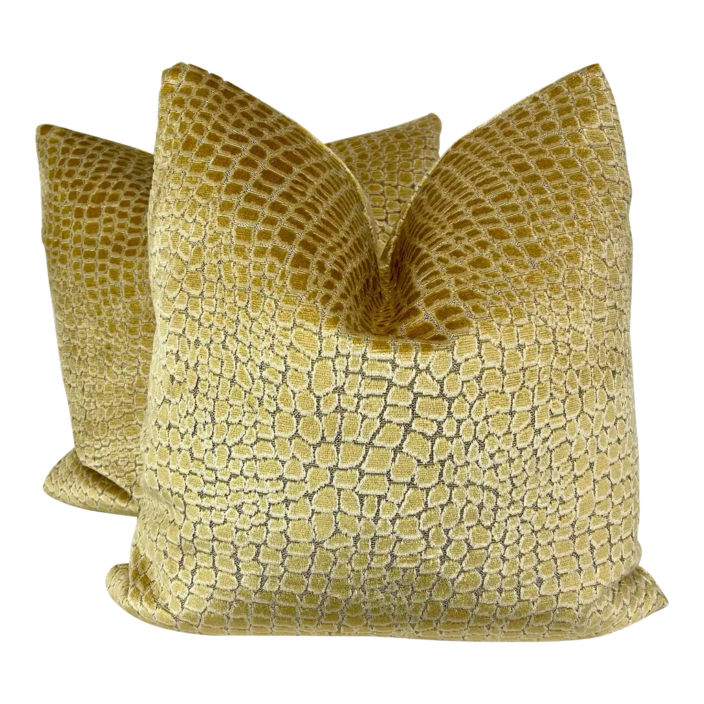 Glorious animal print in raised velvet from Cowtan and Tout. This beautiful fabric is called "Clarence" and retails in the neighborhood of 400.00/yd...(Looks it too).The colorway is "Gold". Pillow covers are sold as pairs and will be backed in an equally plush bugg toned velvet and closure will be by way of an invisible zipper.22" x 22" with plush down inserts.