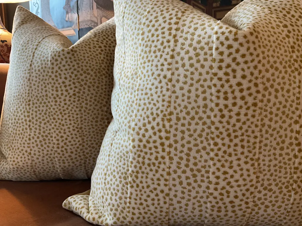 Glorious animal print in raised velvet from Cowtan and Tout. This beautiful fabric is called "Clarence" and retails in the neighborhood of 400.00/yd...(Looks it too). The colorway is "Gold". Pillow covers are sold as pairs and will be backed in an equally plush bugg toned velvet and closure will be by way of an invisible zipper. 22" x 22" with plush down inserts.