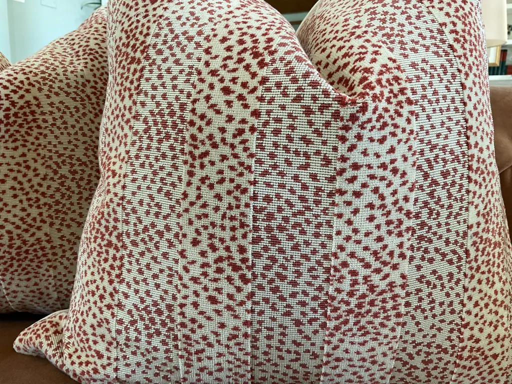 Glorious animal print in raised velvet from Cowtan and Tout. This beautiful fabric is called "Clarence" and retails in the neighborhood of 400.00/yd...(Looks it too). The colorway is "Tomato". Pillow covers are sold as pairs and will be backed in an equally plush bugg toned velvet and closure will be by way of an invisible zipper. 22" x 22" with plush down inserts.