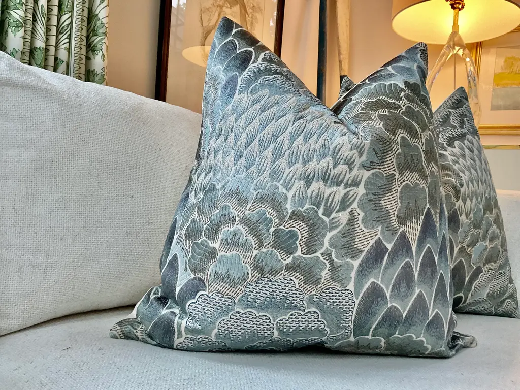 Covered in a rich fabric by famed design house "Cowtan and Tout"....in a stunning shade of Cloud Blue and ivory. Employing a crewel-type embroidered stitch, this pattern is richly textured and showcases intricate looming techniques. This listing is for a pair of 22” down-filled pillows that would add so much elegance to any decor! They are backed in coordinating soft ivory velvet. Closure is by way of invisible zipper.