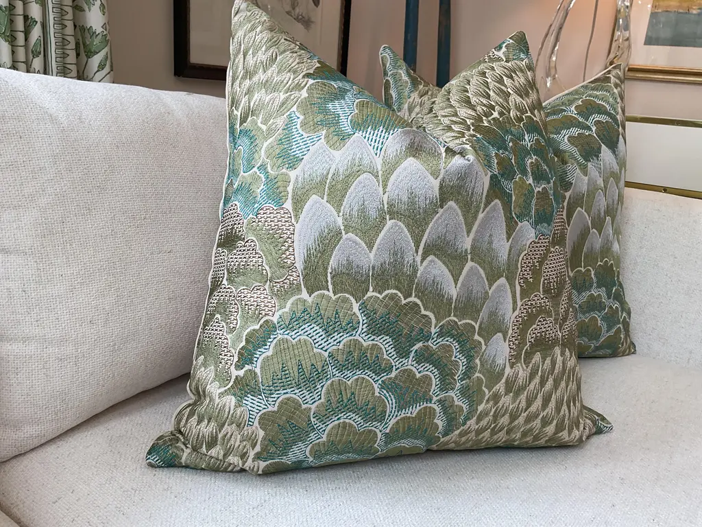 Covered in a rich fabric by famed design house "Cowtan and Tout"....in a stunning shade of rich emerald and ivory. Employing a crewel-type embroidered stitch, this pattern is richly textured and showcases intricate looming techniques. This listing is for a pair of 22” down-filled pillows that would add so much elegance to any decor! They are backed in coordinating soft ivory velvet. Closure is by way of invisible zipper.
