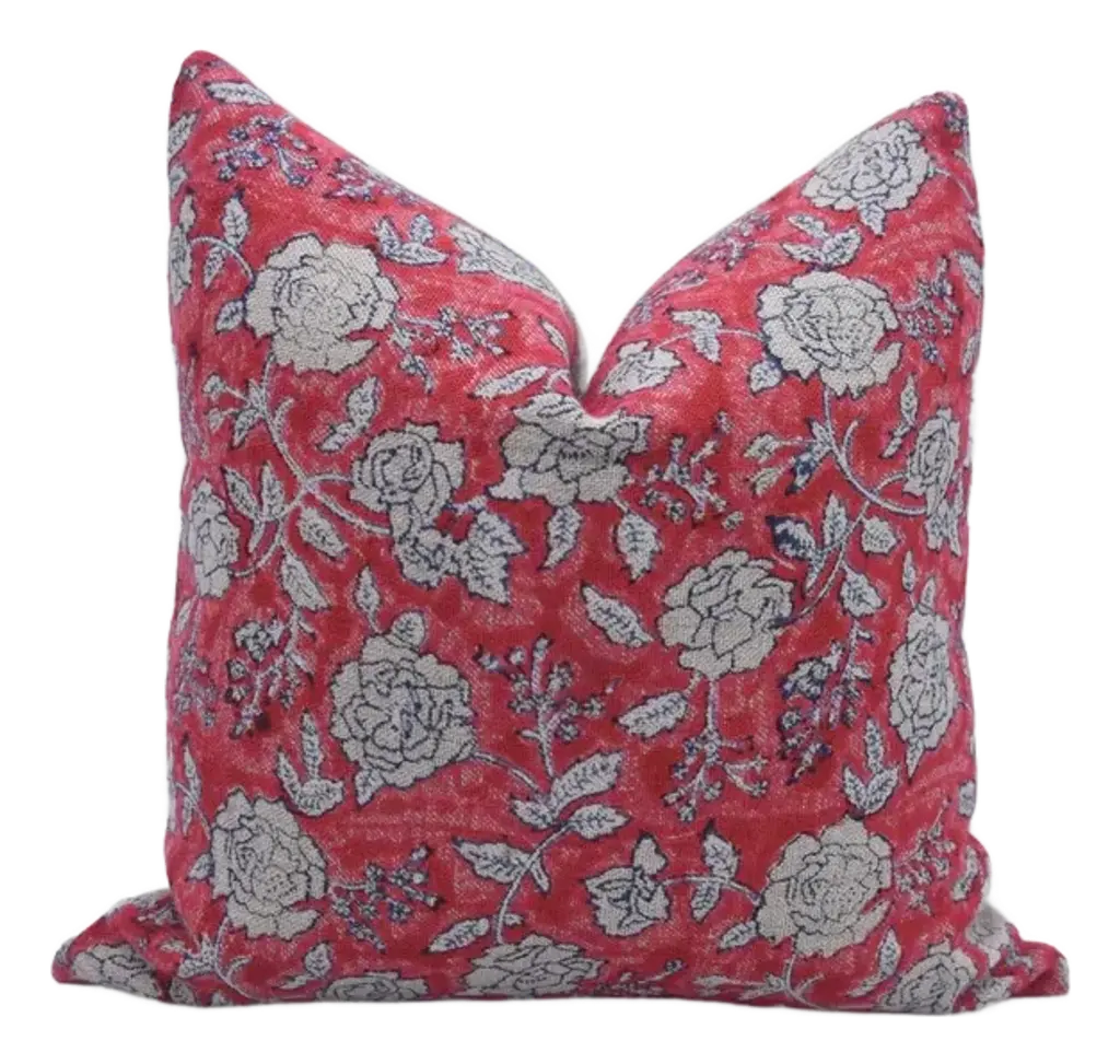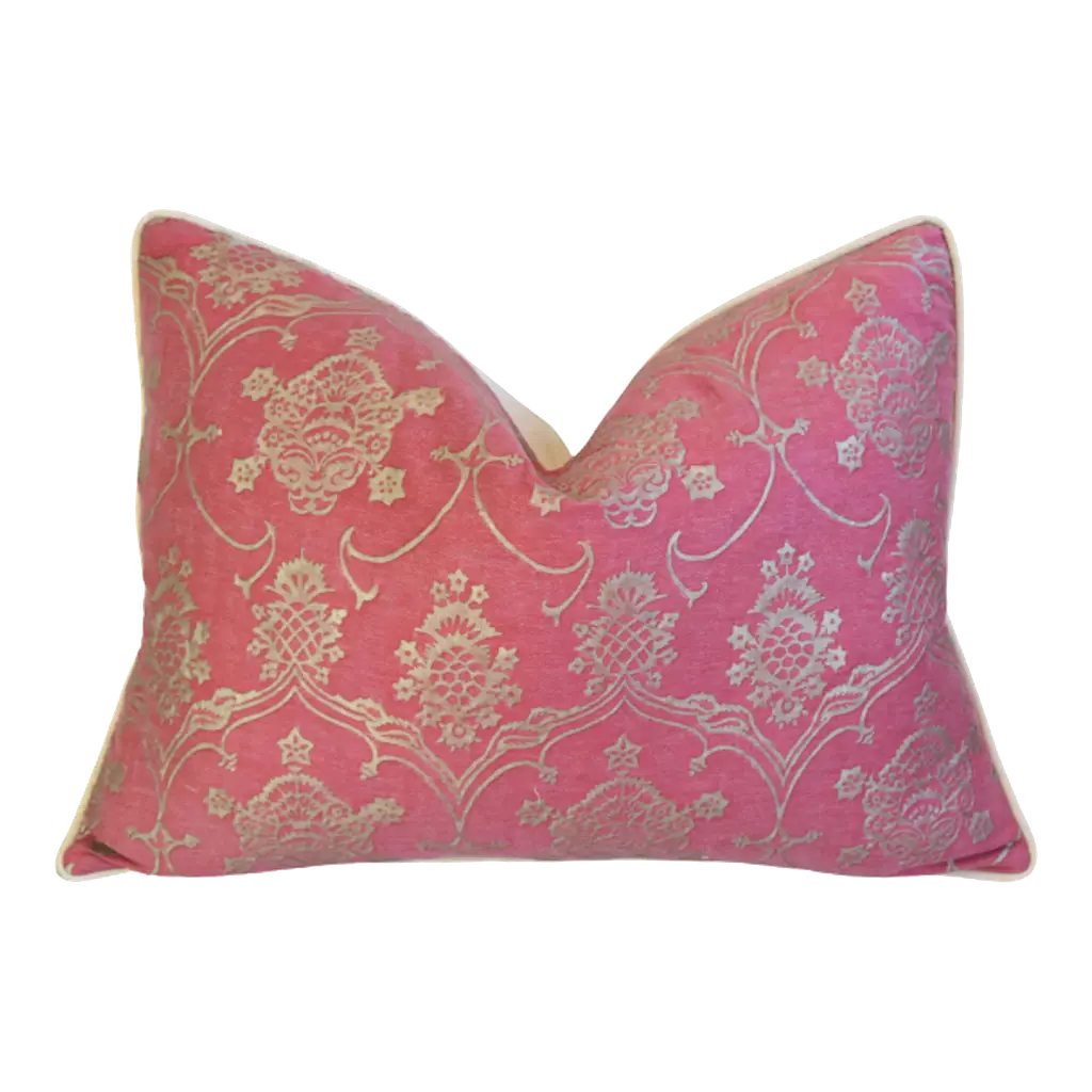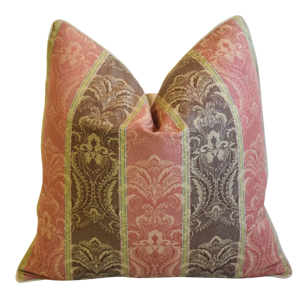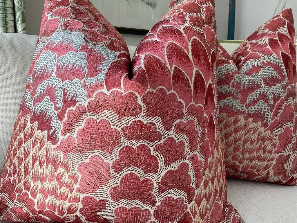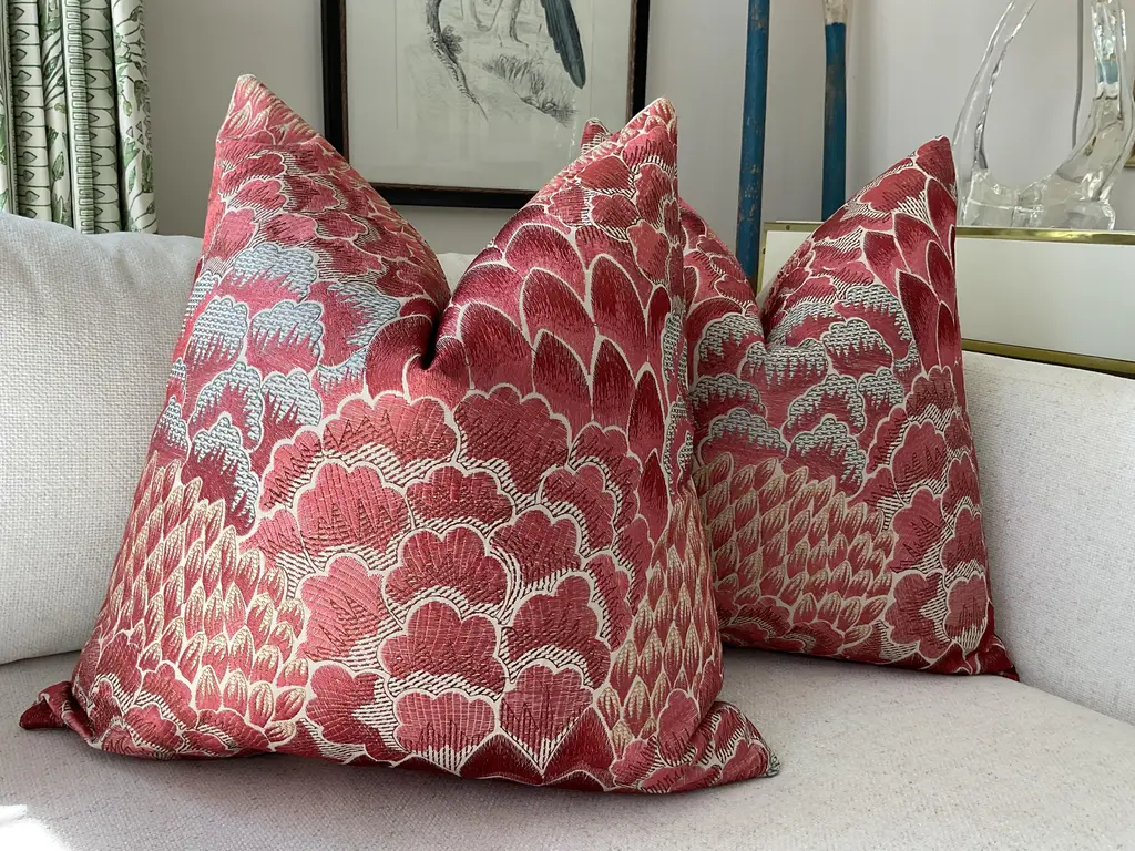Covered in a rich fabric by famed design house "Cowtan and Tout"....in a stunning lacquer shade of rich rose and ivory. Employing a crewel type embroidered stitch, this pattern is richly textured and showcases intricate looming techniques. This listing is for a pair of 22” down filled pillows that would add so much elegance to any decor! They are backed in coordinating soft ivory velvet. Closure is by way of invisible zipper.