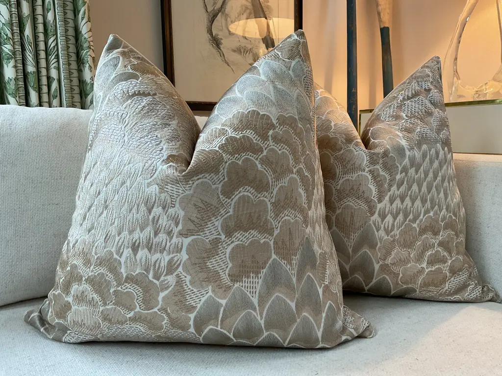 Covered in a rich fabric by famed design house "Cowtan and Tout"....in a stunning shade of rich sand and ivory. Employing a crewel-type embroidered stitch, this pattern is richly textured and showcases intricate looming techniques. This listing is for a pair of 22” down-filled pillows that would add so much elegance to any decor! They are backed in coordinating soft sand velvet. Closure is by way of an invisible zipper.