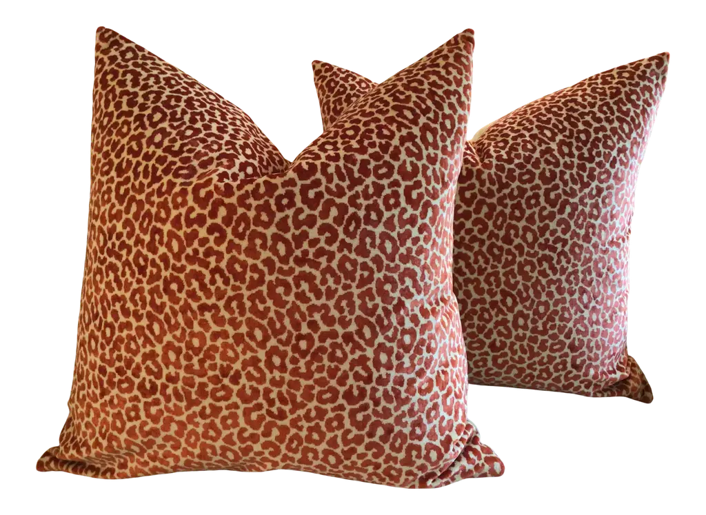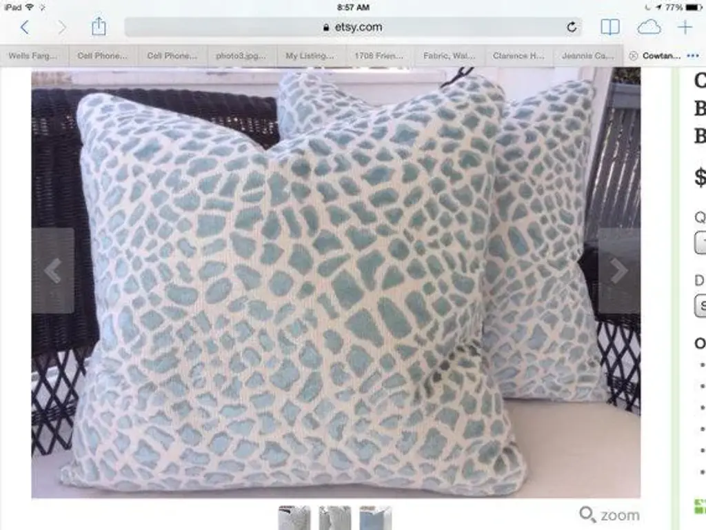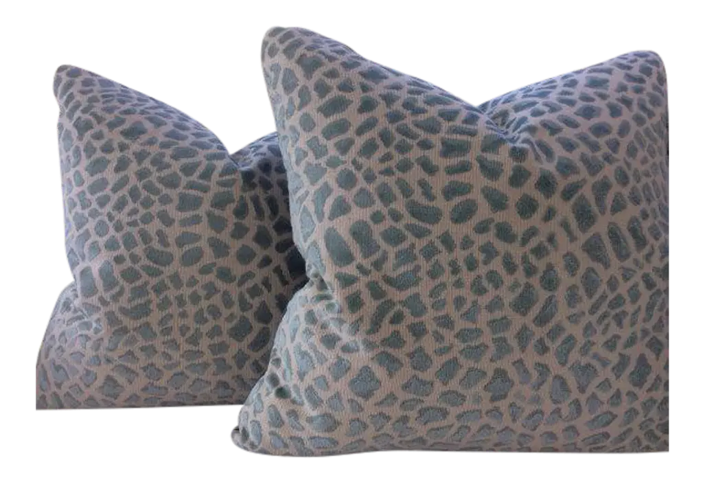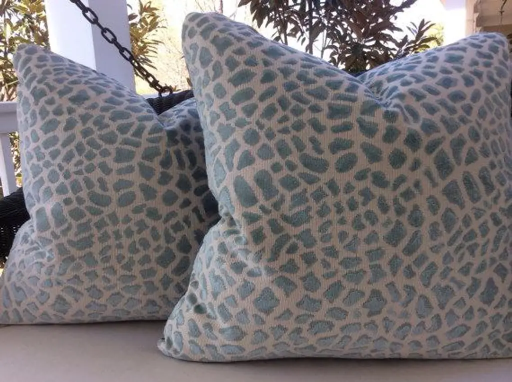 Covered in a rich fabric by famed design house "Cowtan and Tout"....in a lush icy aqua blue leopard print, these covers would add so much elegance to any decor! They are backed in a coordinating soft ivory velvet and features an invisible zipper. This "To The Trade" only fabric retails at 332.00/ yard through traditional channels, but you can buy it here, already made into a fabulous pair of down pillows at a fraction of the cost. ABOUT ACCENT MARKS PRODUCTS: Each pillow cover is handmade with the highest quality fabrics and zippered for easy access. These pillows measure 22"x22" and include inserts. This listing is for a pair of pillows.