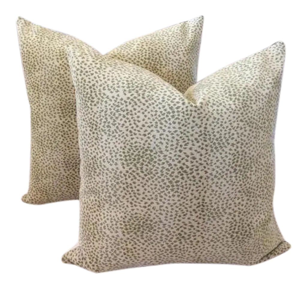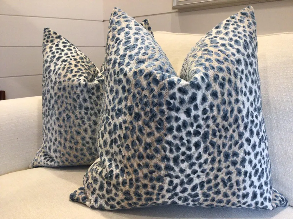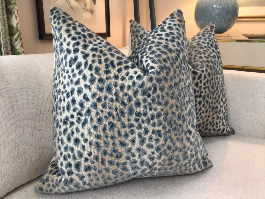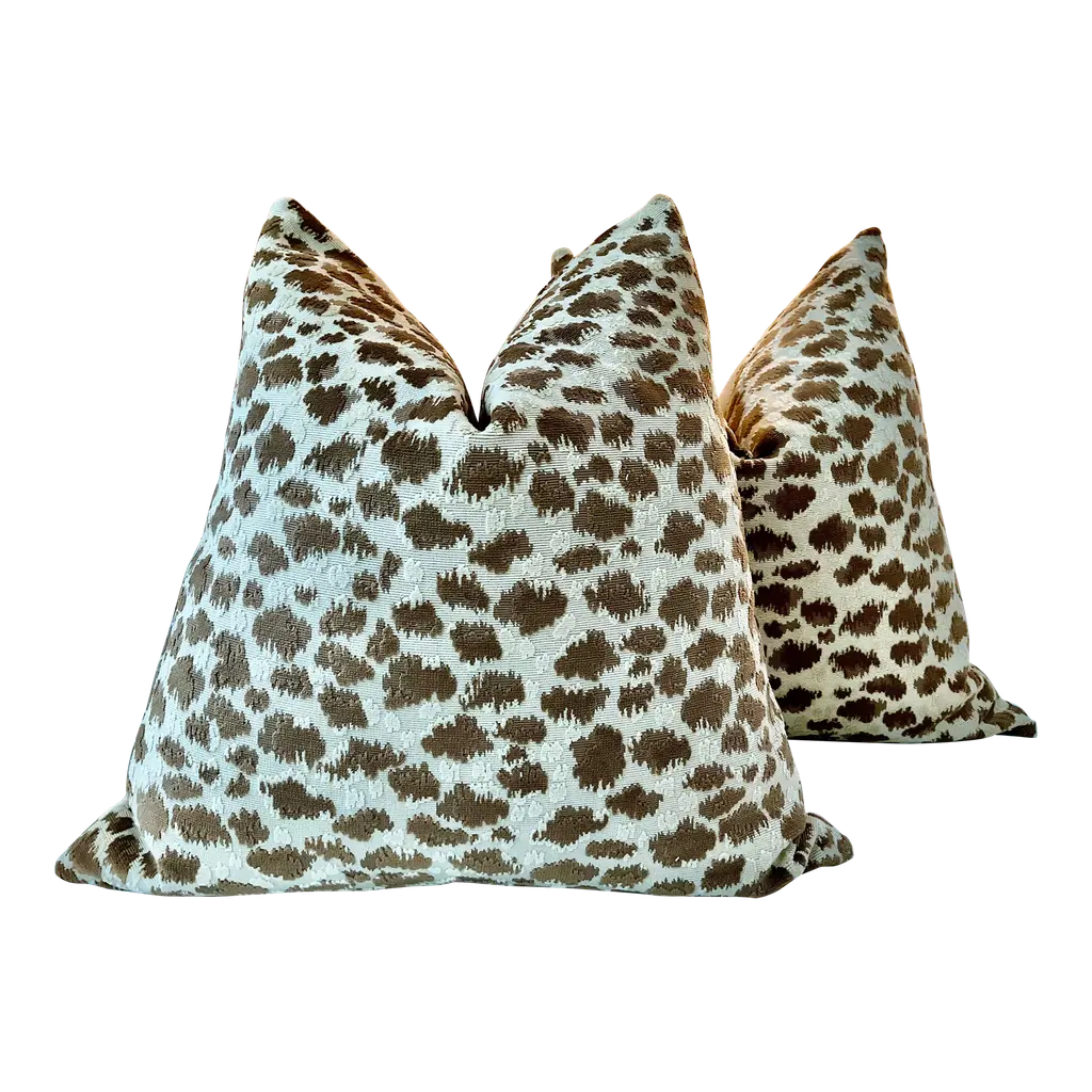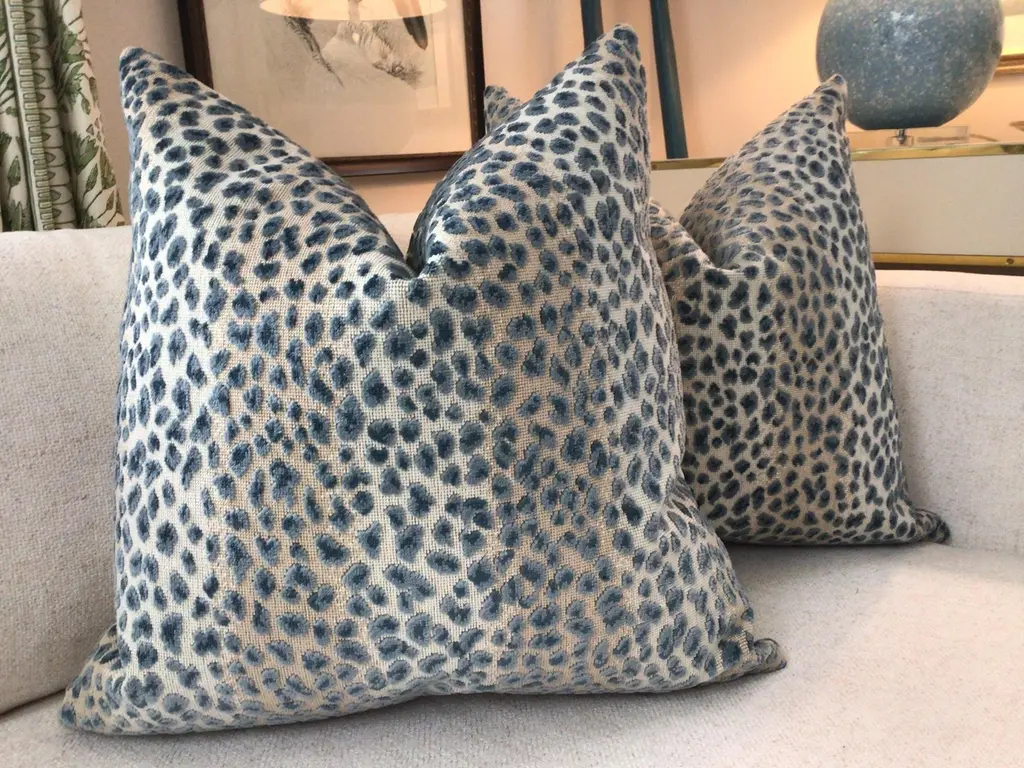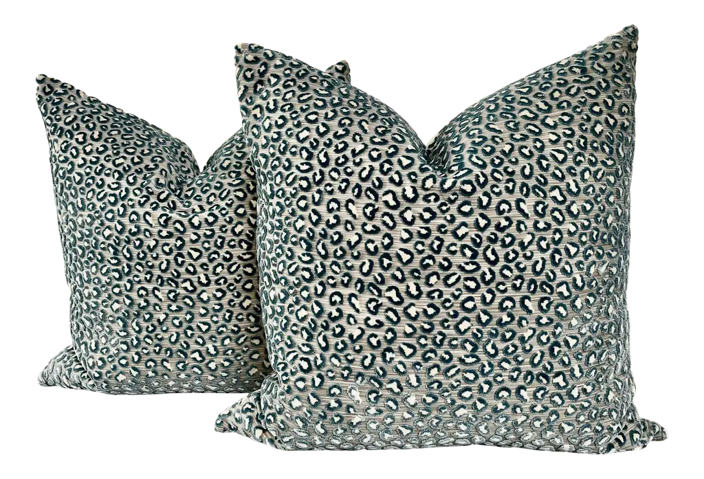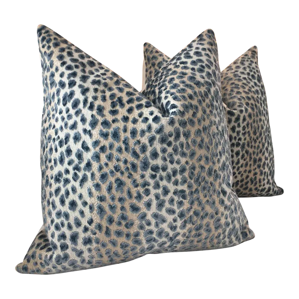 Glorious animal print in raised velvet from Cowtan and Tout. This beautiful fabric is called "Ocelot" and retails in the neighborhood of 400.00/yd...(Looks it too). The colorway is Azure and these will be backed in an equally plush bone toned velvet and closure will be by way of an invisible zipper. This ready-to-use PAIR will measure 22” each will come complete with generous down inserts. Exquisite!