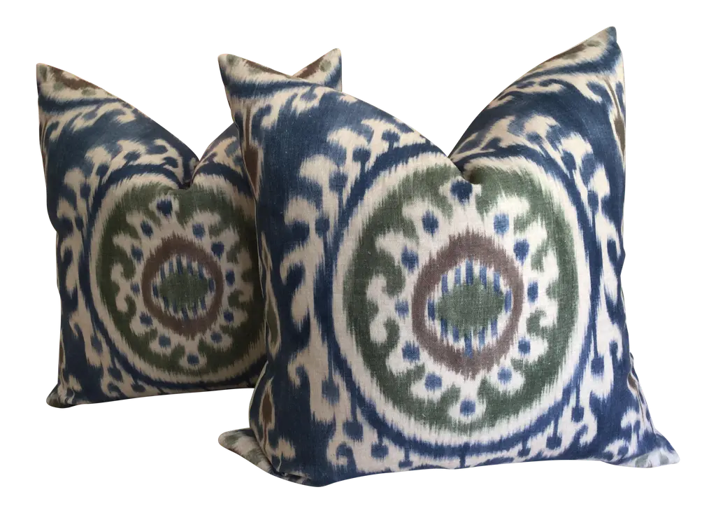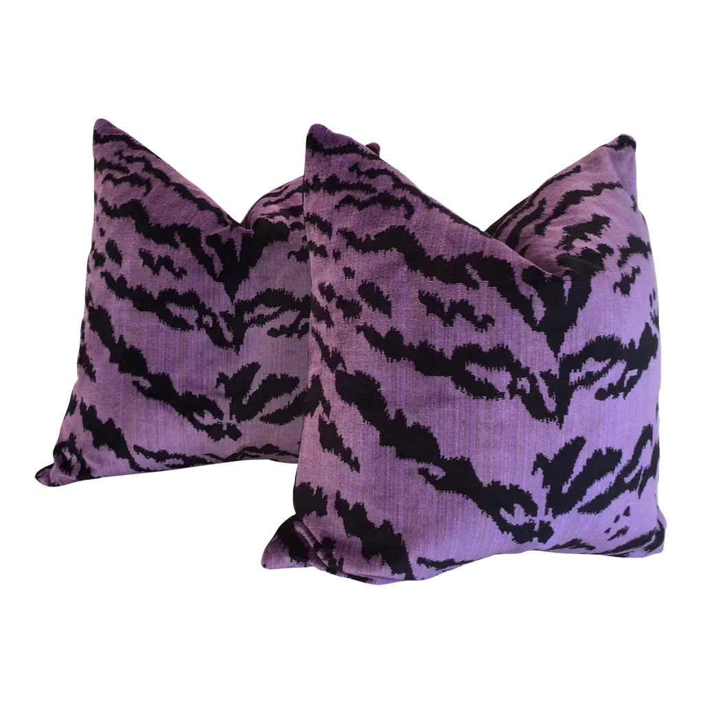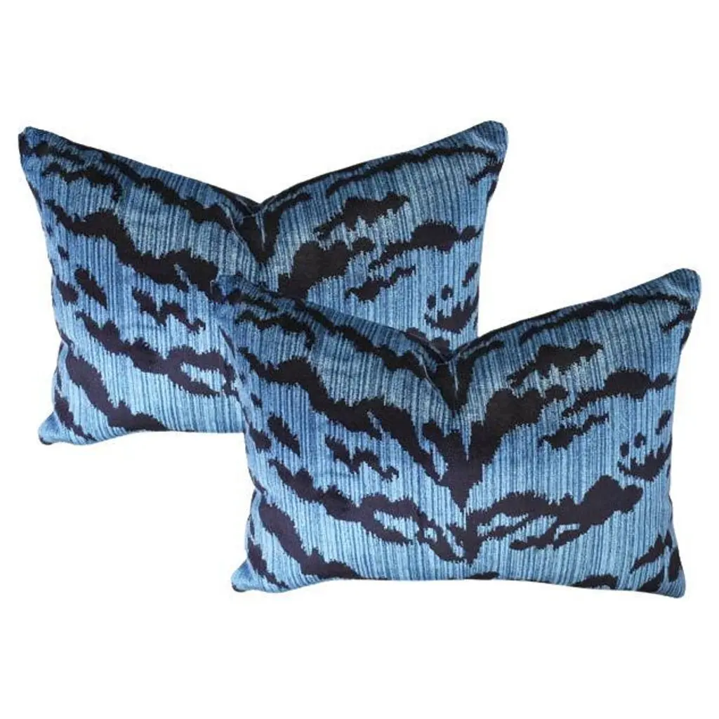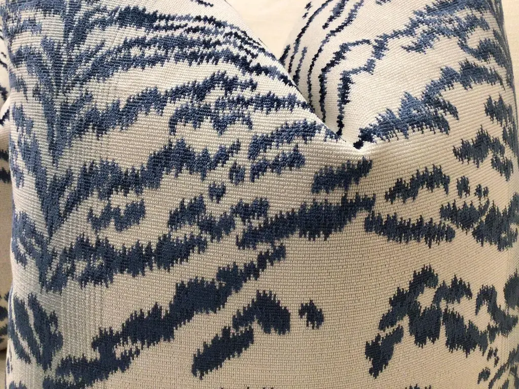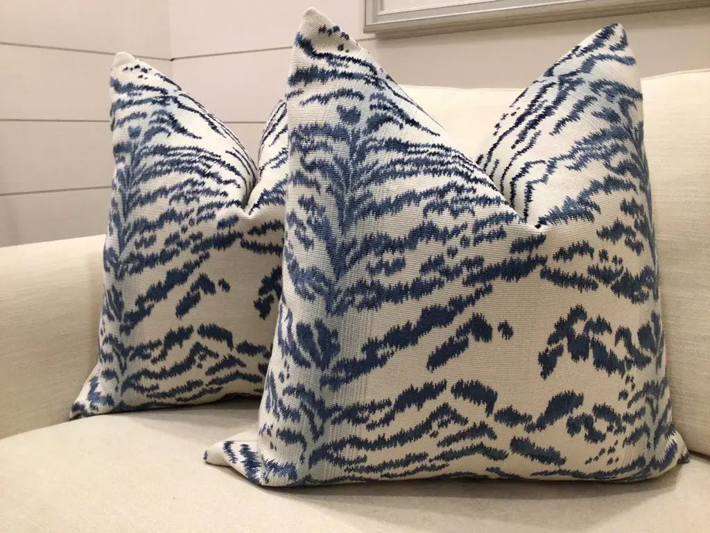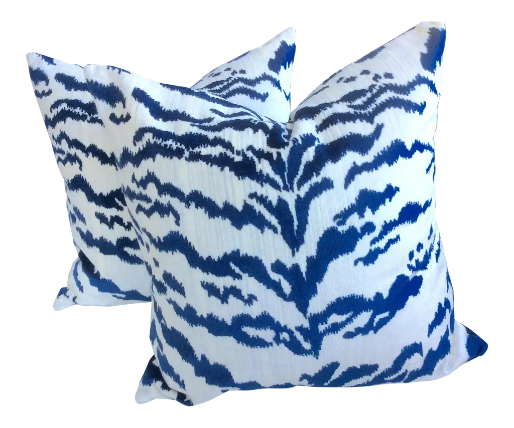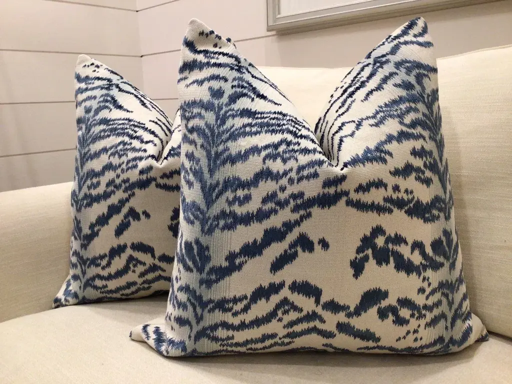 Covered in a rich fabric by famed design house "Cowtan and Tout"....in a lapis and off white tiger, this cover in "RAJAH would add so much elegance to any decor! It is backed in a coordinating soft ivory velvet and features an invisible zipper.. These pillows measure 22"x22" and include generous down inserts. This listing is for a pair of pillows.