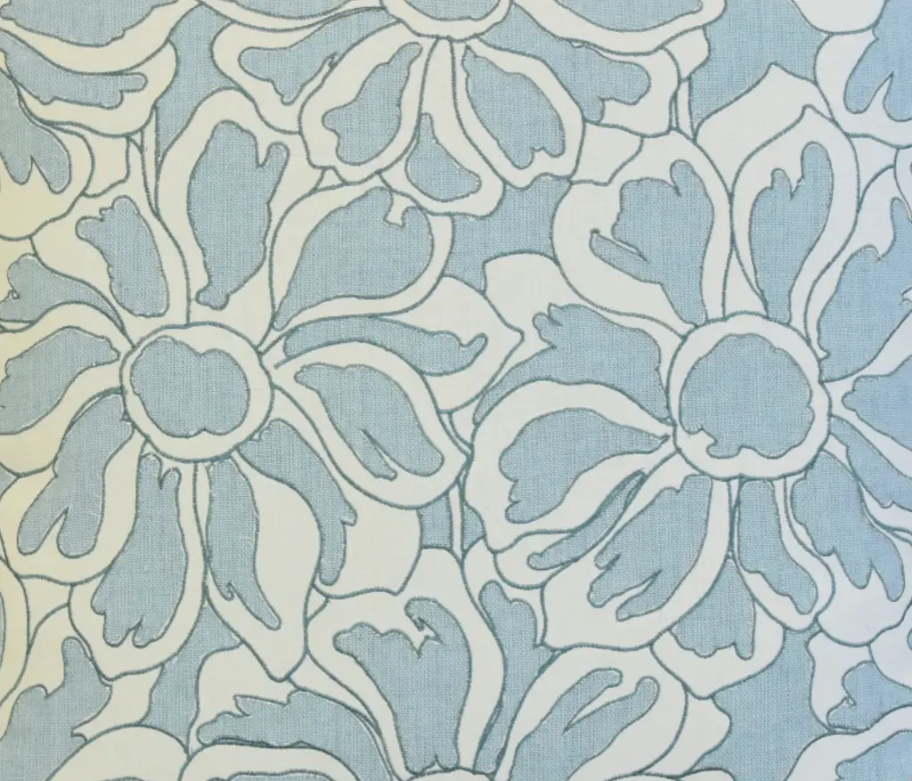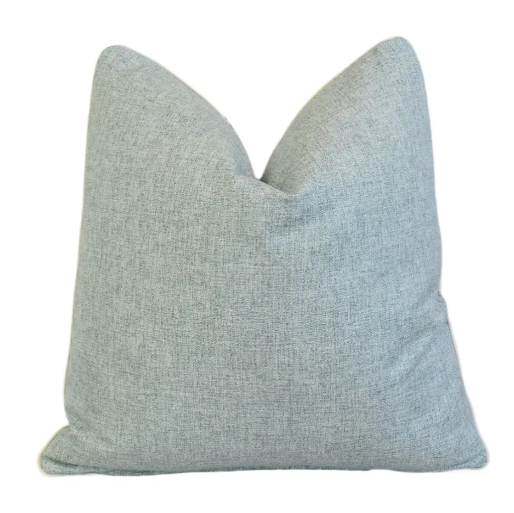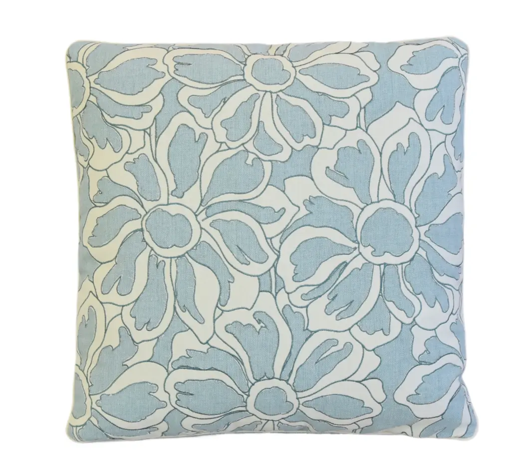 Custom-tailored pillow in designer Cowtan & Tout appliqu���������� embroidery cotton and linen fabric called "Capri” depicting a stunning sky-blue floral flower design. Complementary linen fabric on the reverse. Custom cord piping trim. Zipper closure. Generous plump goose feather-and-down insert. Excellent new, unused beautiful condition!!