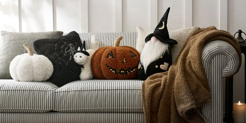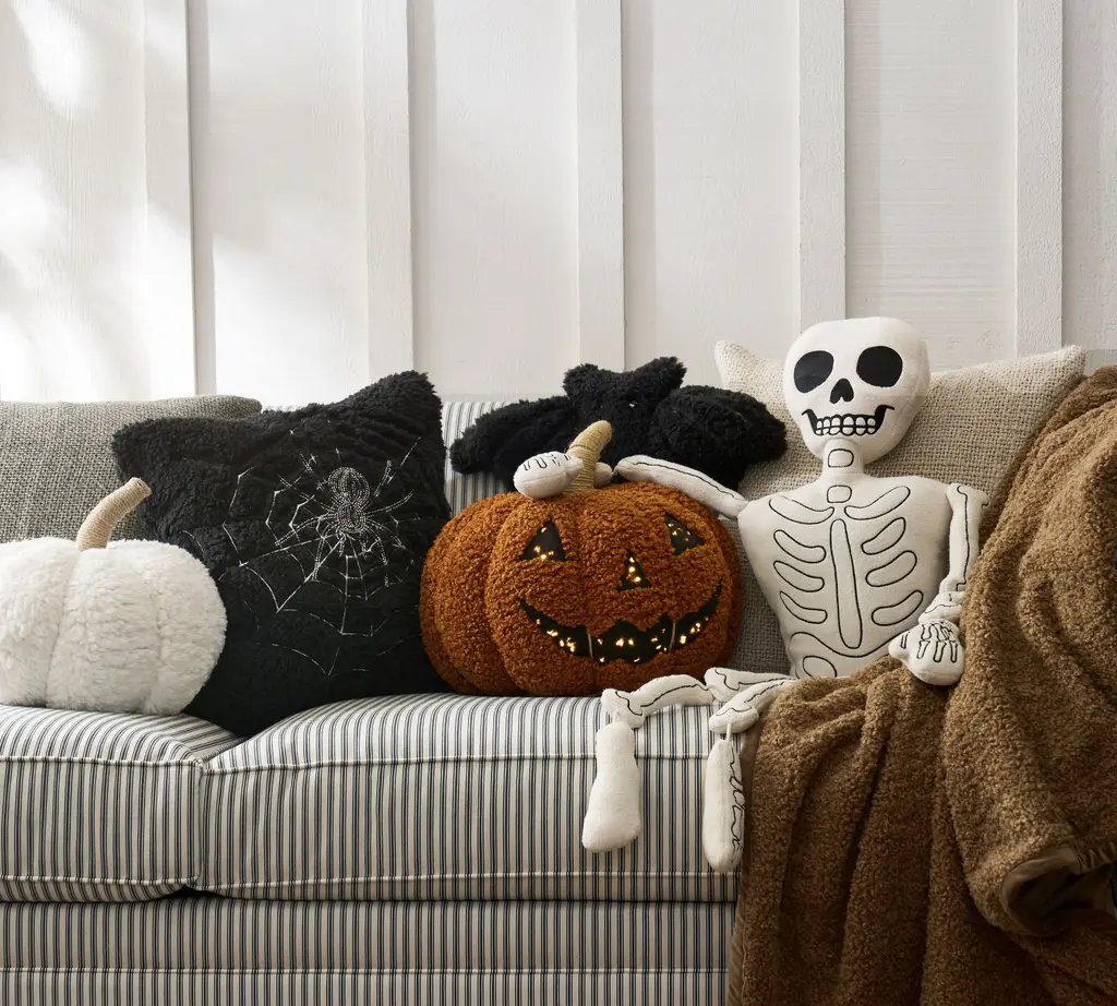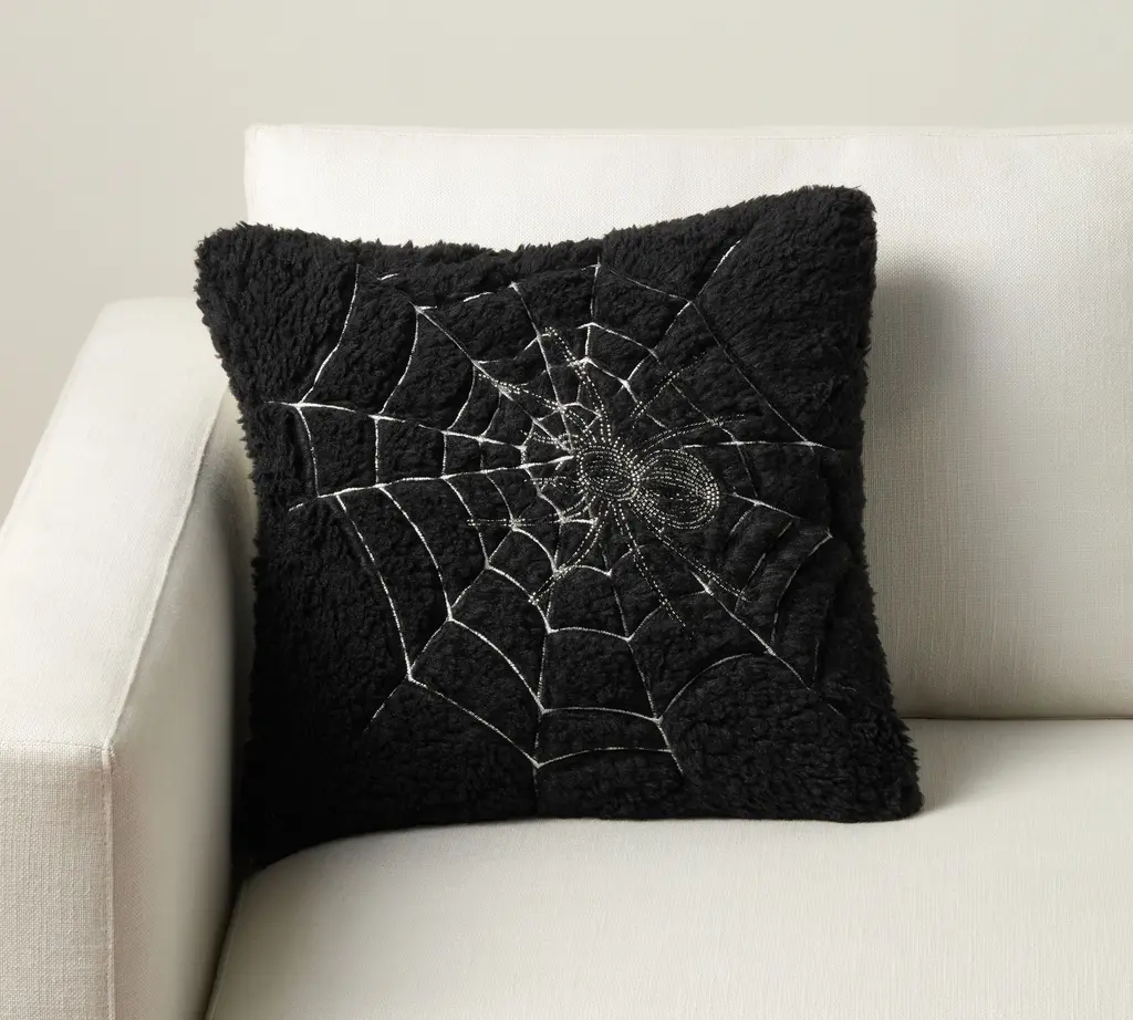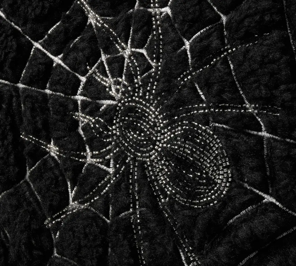 White embroidery pops on plush, black sherpa. Beading embellishments add zing because the scary season needs the treat of some sparkle, too.