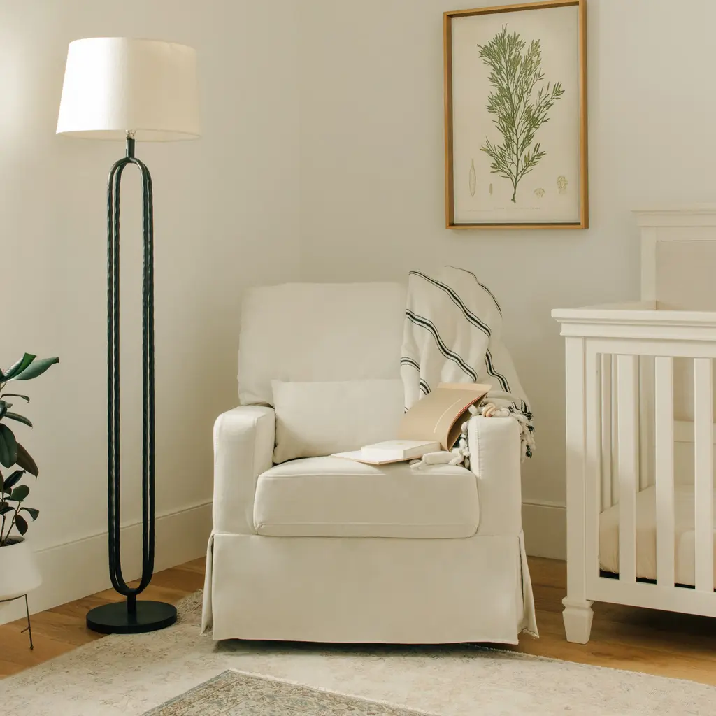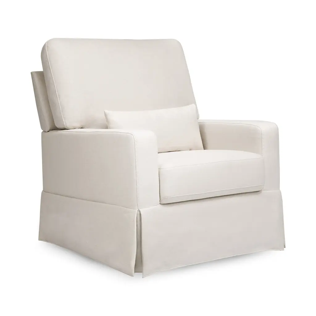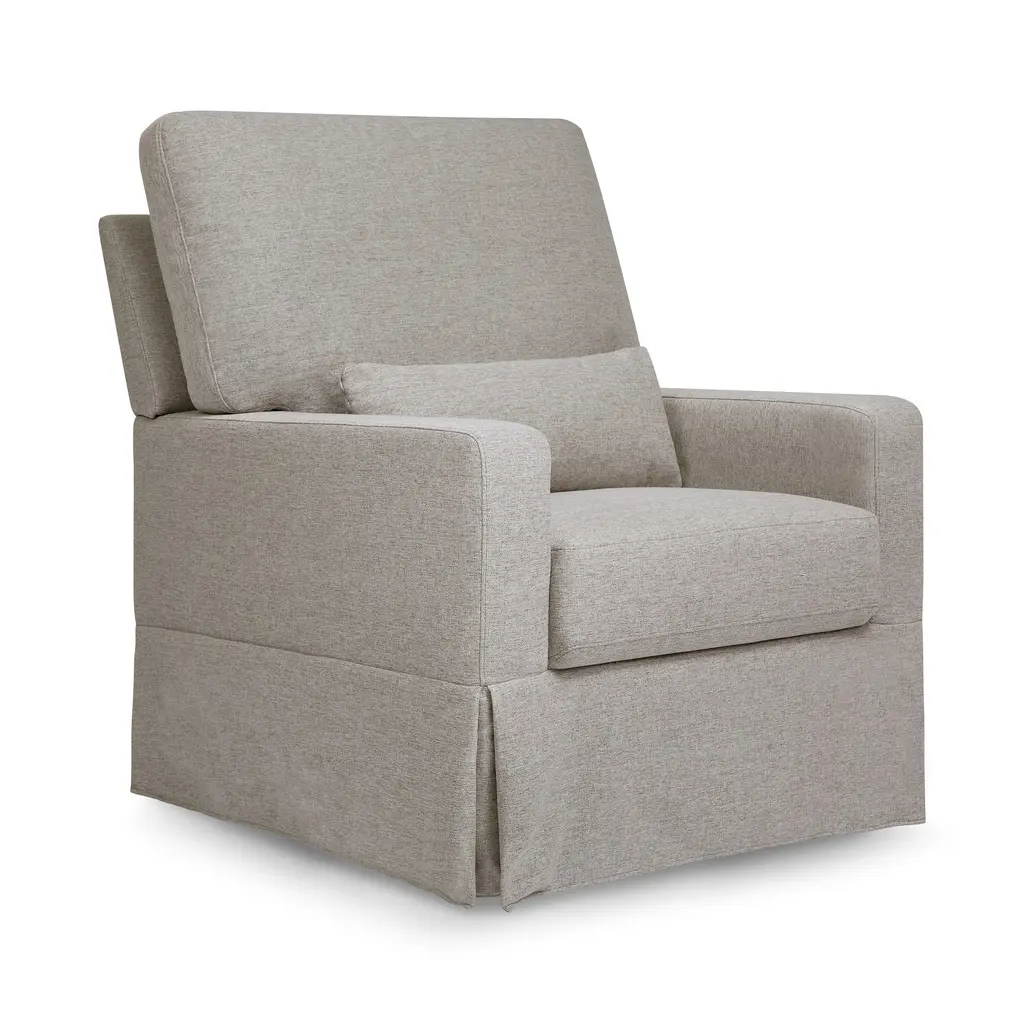 Experience ultimate comfort and style with the Crawford Pillowback Comfort Swivel Glider from Namesake. The plush pillow back cushion and wide seat provide unparalleled nursery comfort, while the smooth gliding and convenient swivel motion make it easy to soothe your baby to sleep. With a beautifully crafted design and stain-resistant upholstery for everyday living, this glider is a must-have for any nursery. Highlights