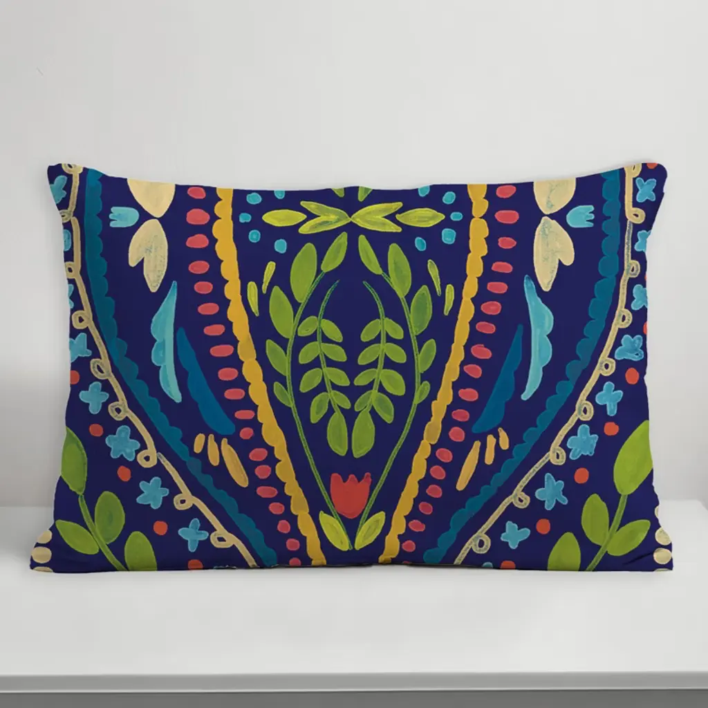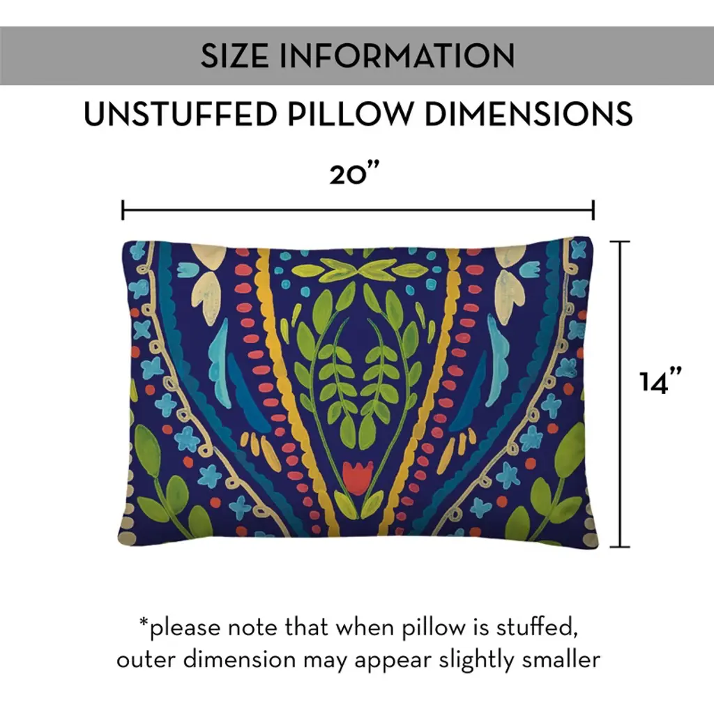 This patterned pillow will add the perfect touch of color to your home. Designed and printed in the United States, this throw pillow is printed to display vibrant colors, resulting in a unique design you're sure to love. Our beautiful indoor/outdoor pillows are designed and printed in the USA. Double-sided Print 14x20 Cover Material: Spun Polyester Fill Material: Polyester/Polyfill Removable Cover: No No UV protection Stain, mildew, and water resistant Washing Method: Spot clean and dry clean only