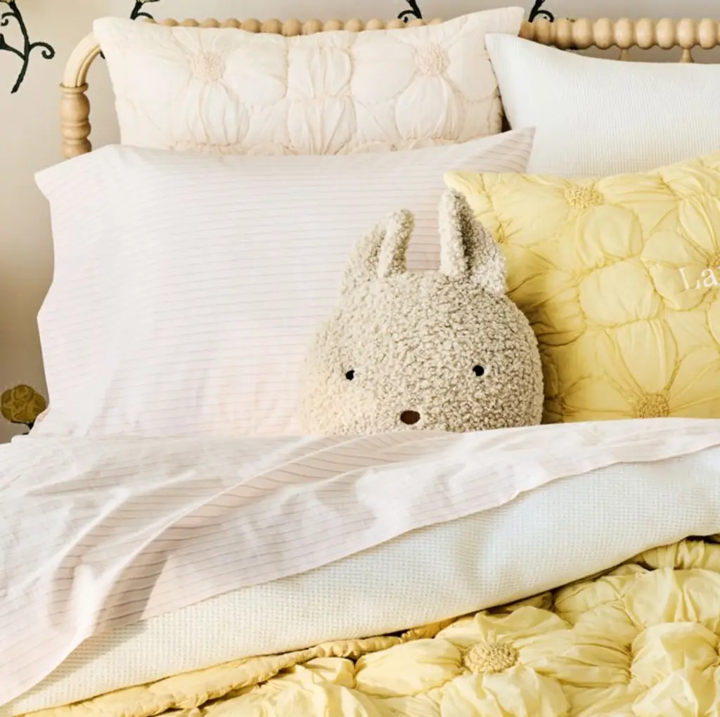 All the feels: Made of supersoft sherpa, our Bunny Face Throw Pillow is the cuddliest-ever sidekick. The pillow features cute perky ears and embroidered details, plus fleecy fur in a gorgeous neutral oatmeal hue.