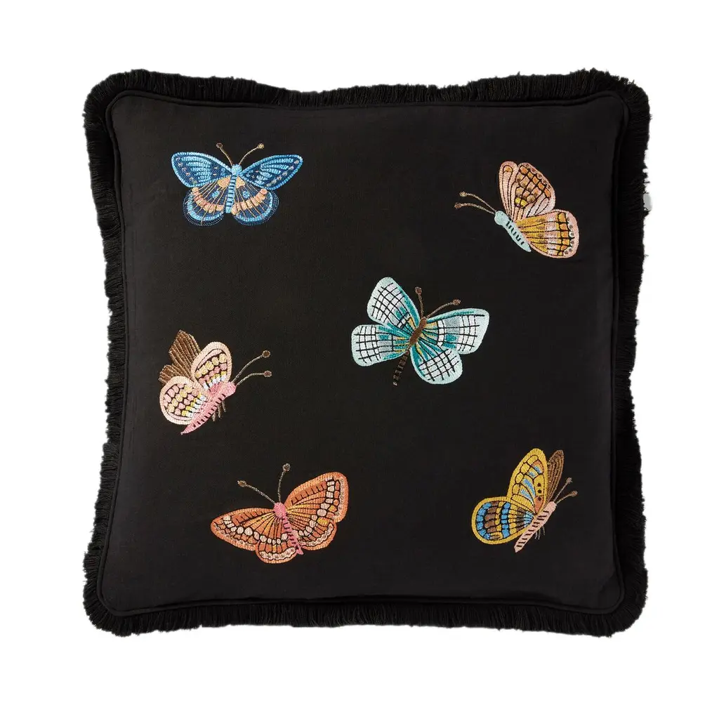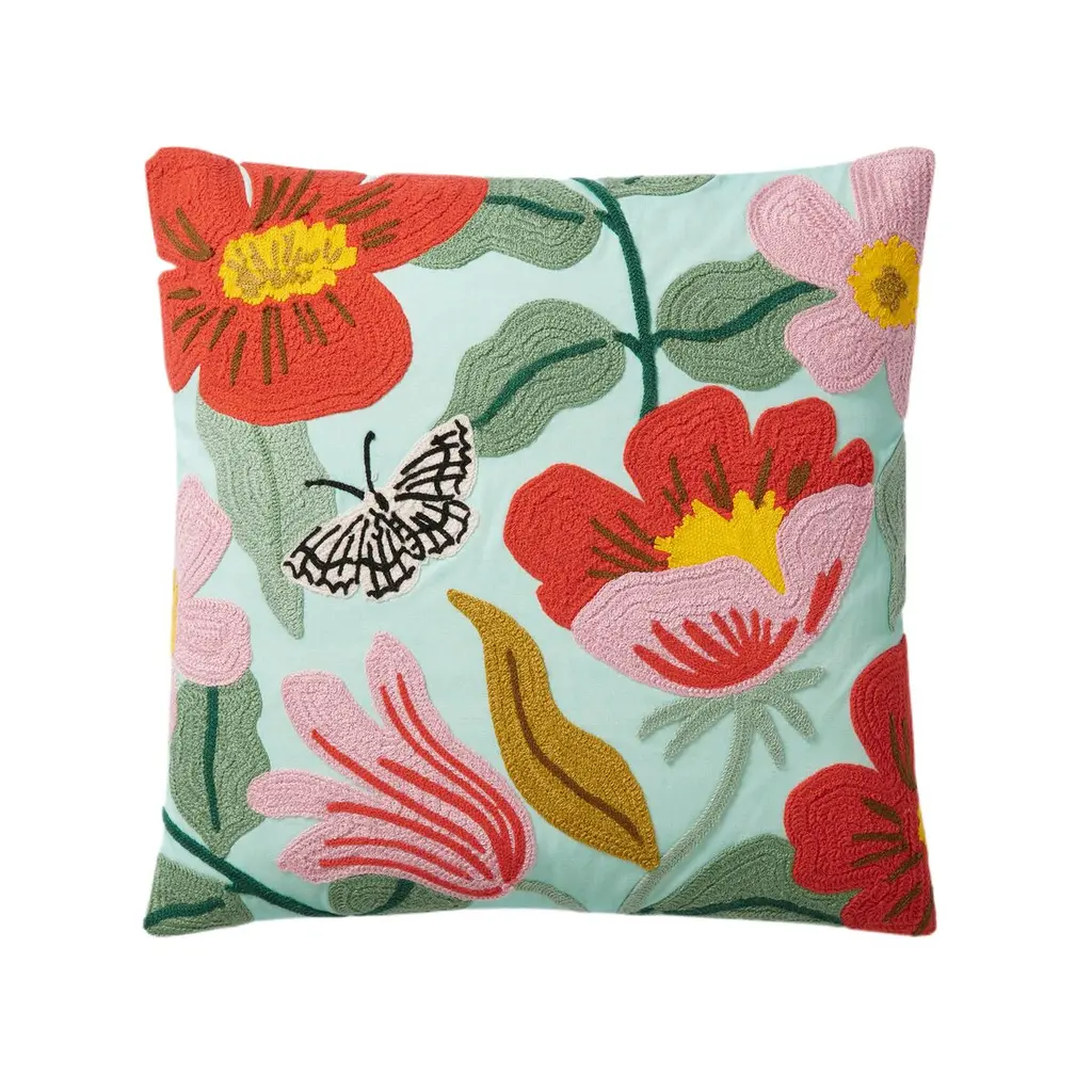 The Curio Pillow features a vibrant, eclectic design with a crisp white base adorned with rich, colorful patterns. Its geometric or floral motifs add depth and texture, making it a stylish and comfortable accent for any space. Perfect for infusing personality and warmth into your decor!