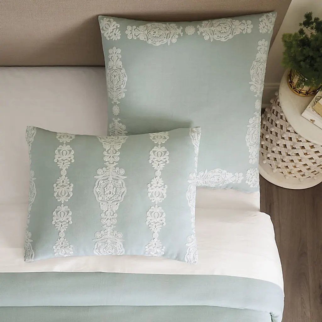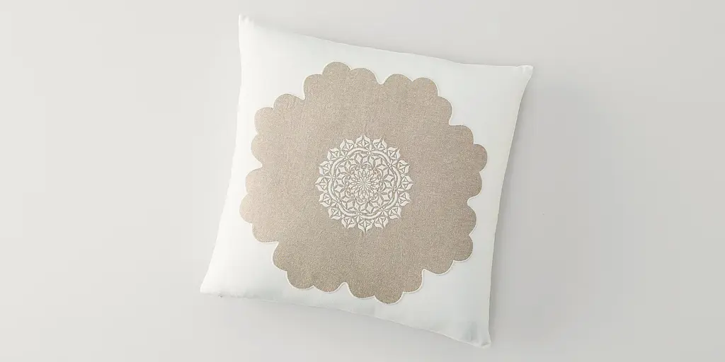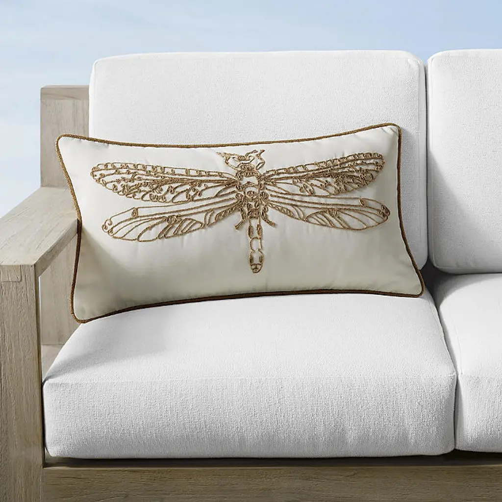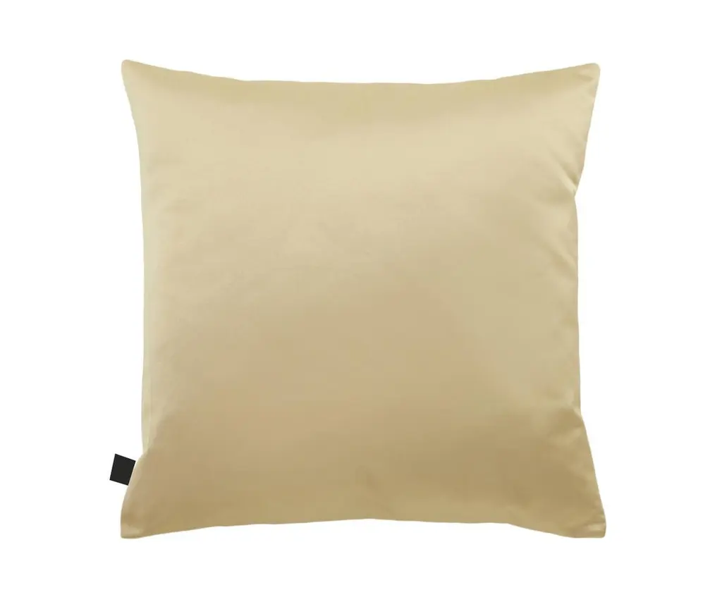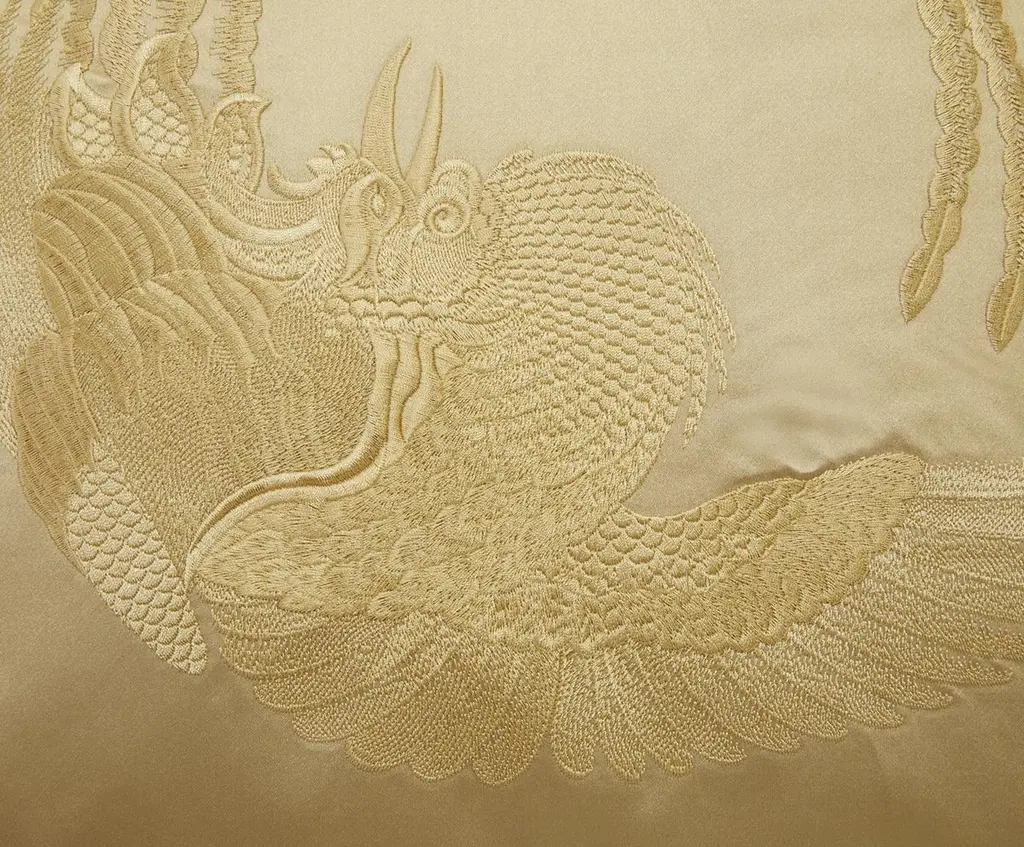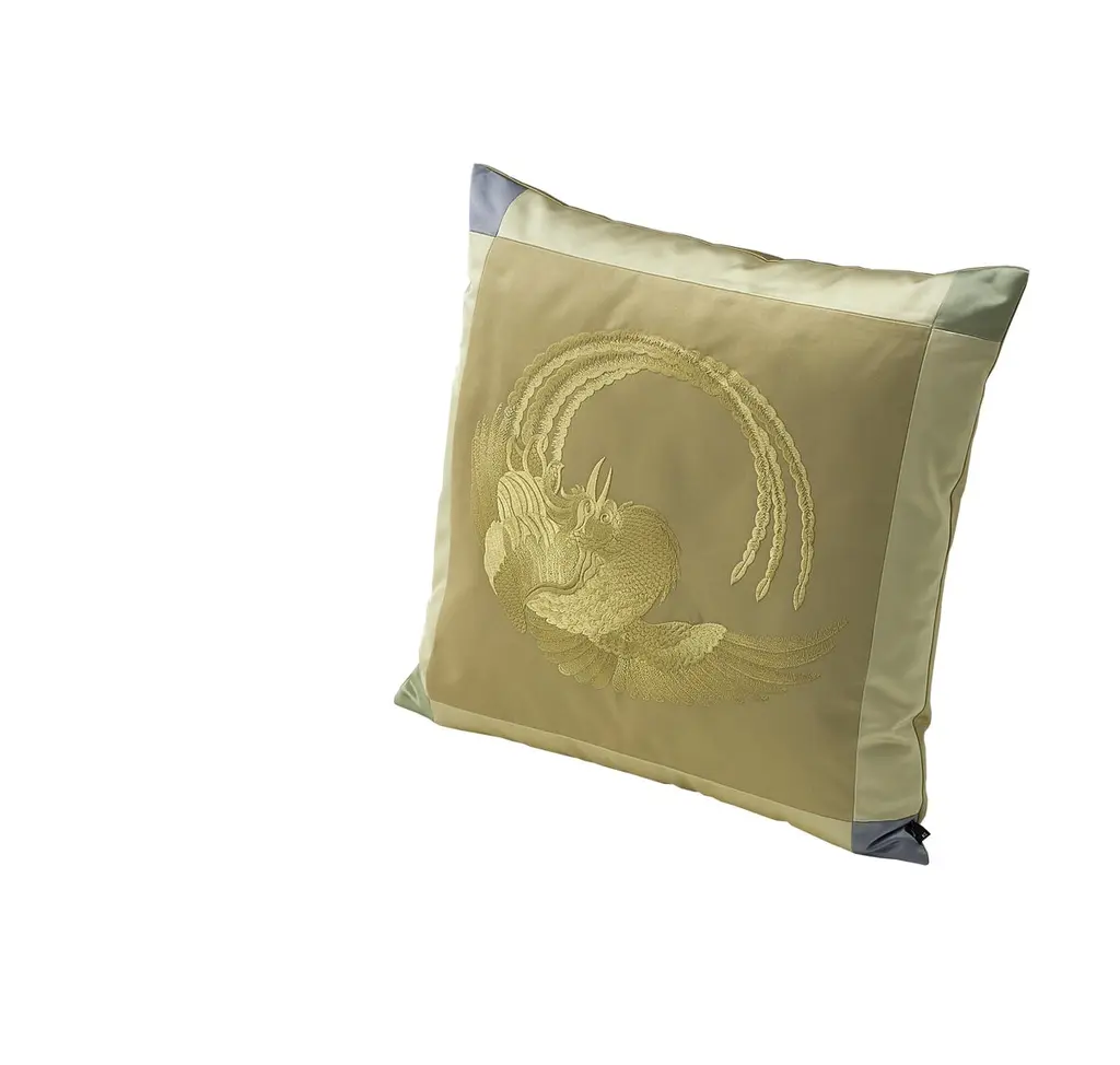 Square cushion in a natural gold colour with a delicate, tone-on-tone phoenix embroidery framed with contrasting, multicolour fabric. The phoenix is a Japanese symbol for rebirth and longevity.