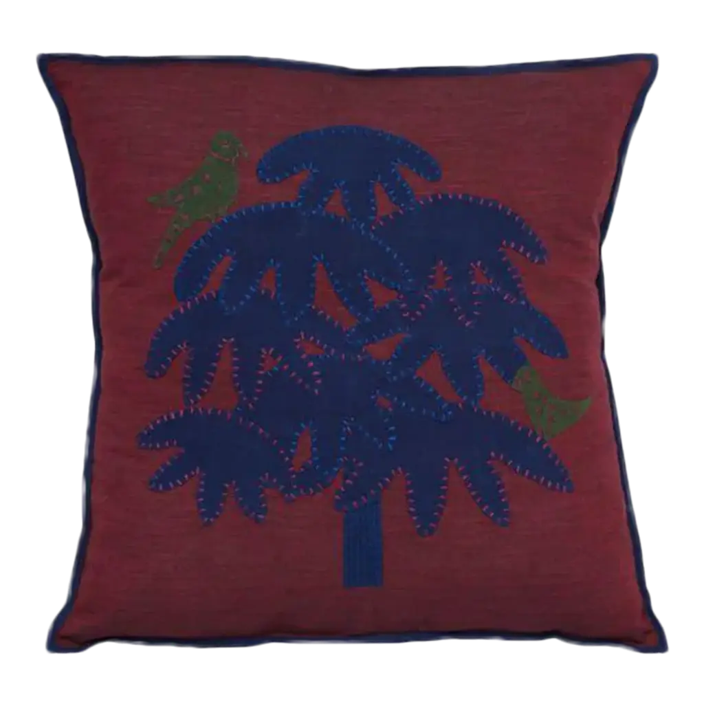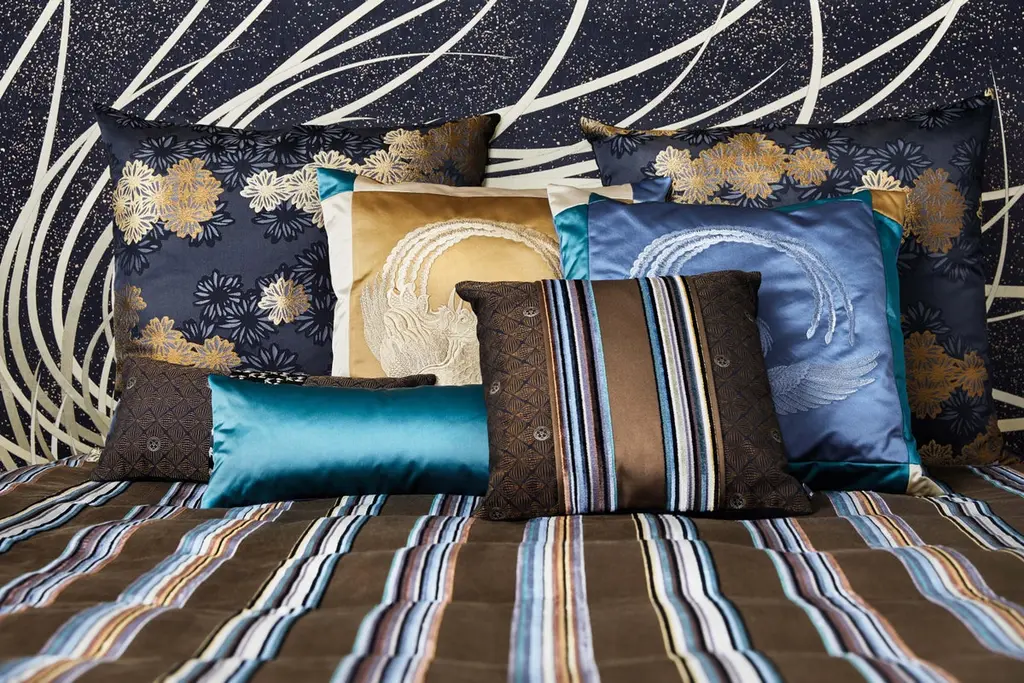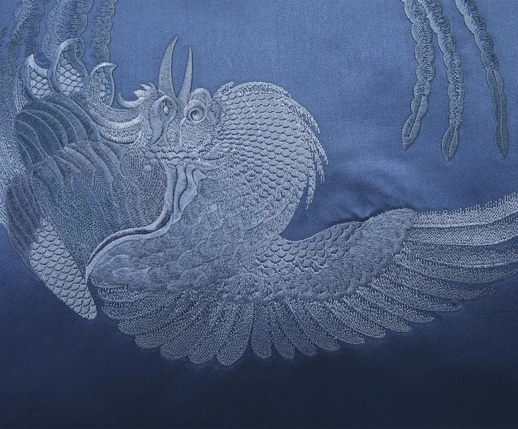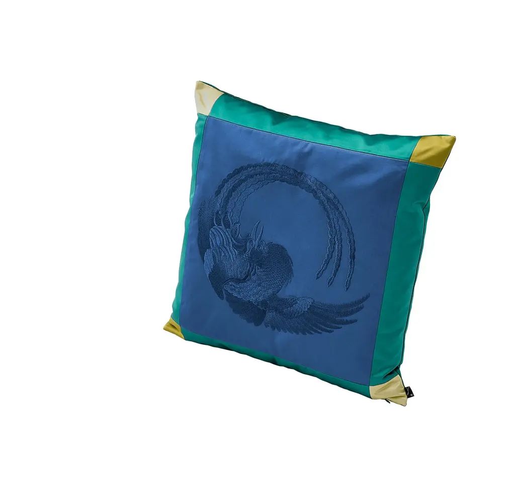 Square cushion in a rich blue colour with a delicate, tone-on-tone phoenix embroidery framed with contrasting, multicolour fabric. The phoenix is a Japanese symbol for rebirth and longevity.