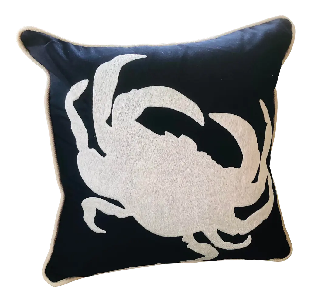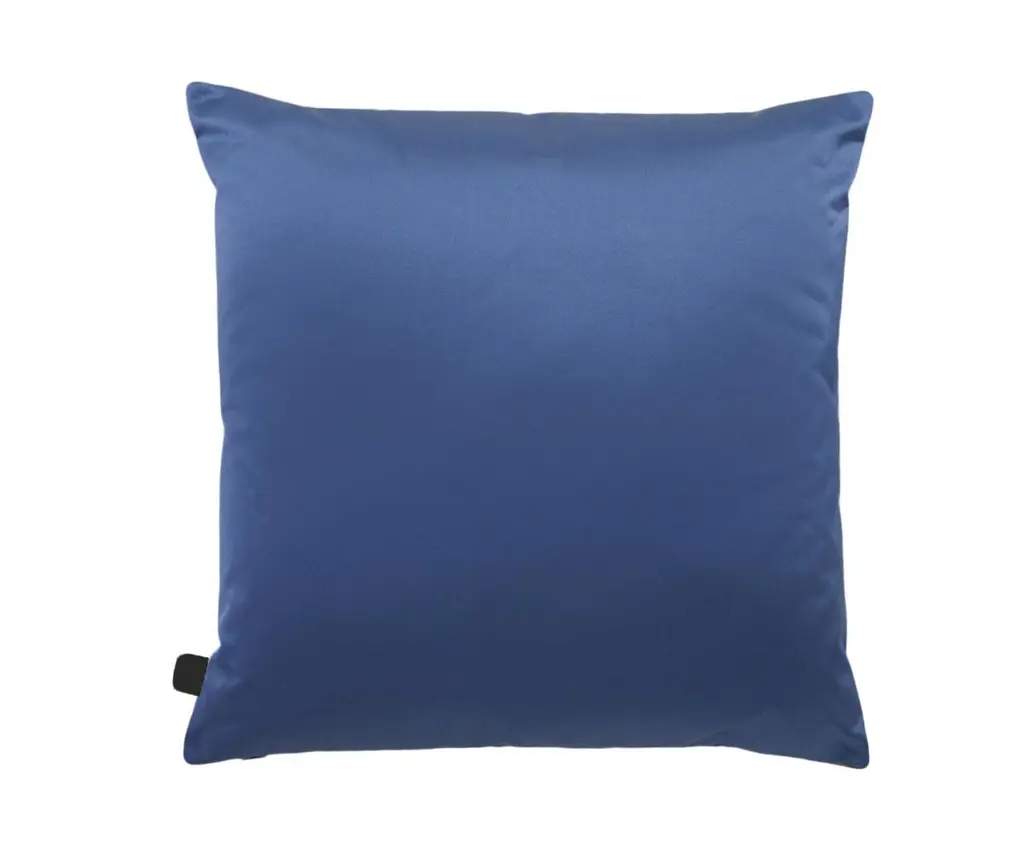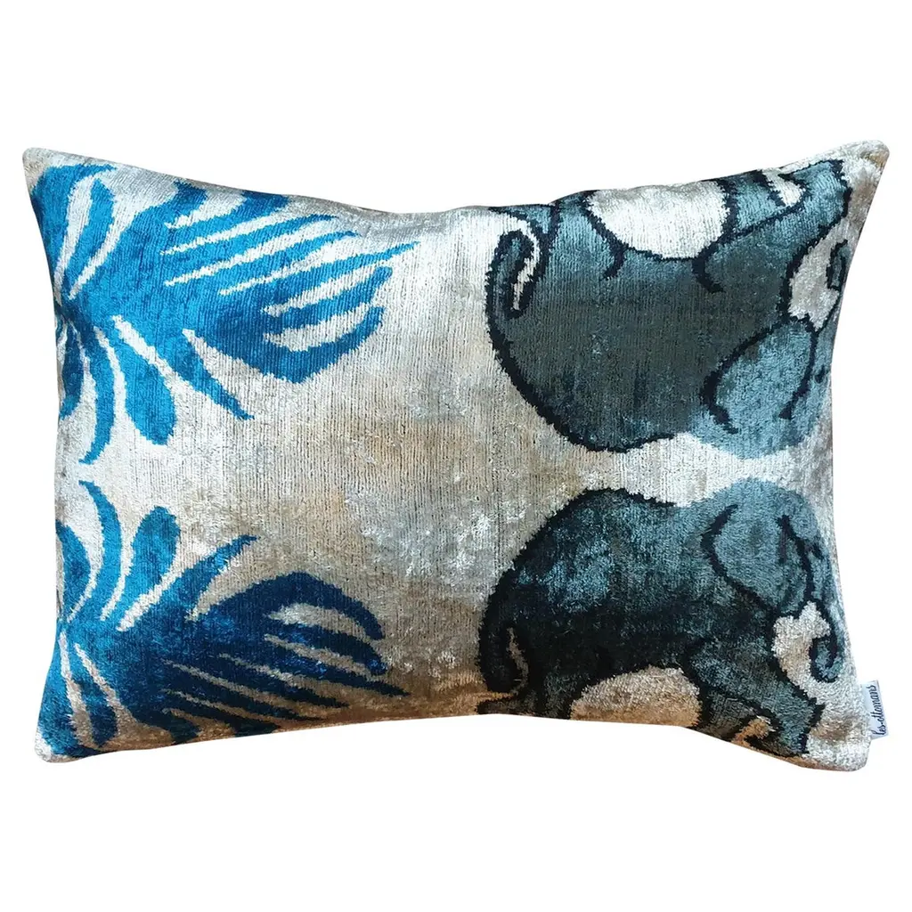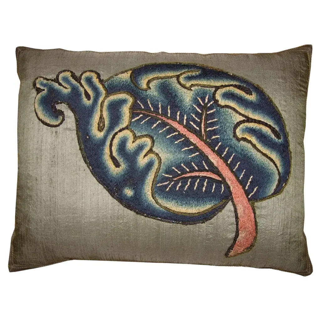 Square cushion in a rich blue colour with a delicate, tone-on-tone phoenix embroidery framed with contrasting, multicolour fabric. The phoenix is a Japanese symbol for rebirth and longevity.