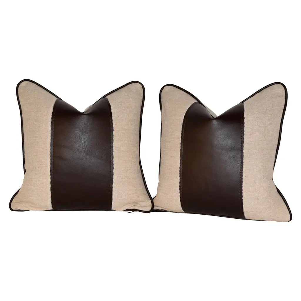 Custom Black Stripe And Leather Pillow With Contrast Top Stitch With Down Insert