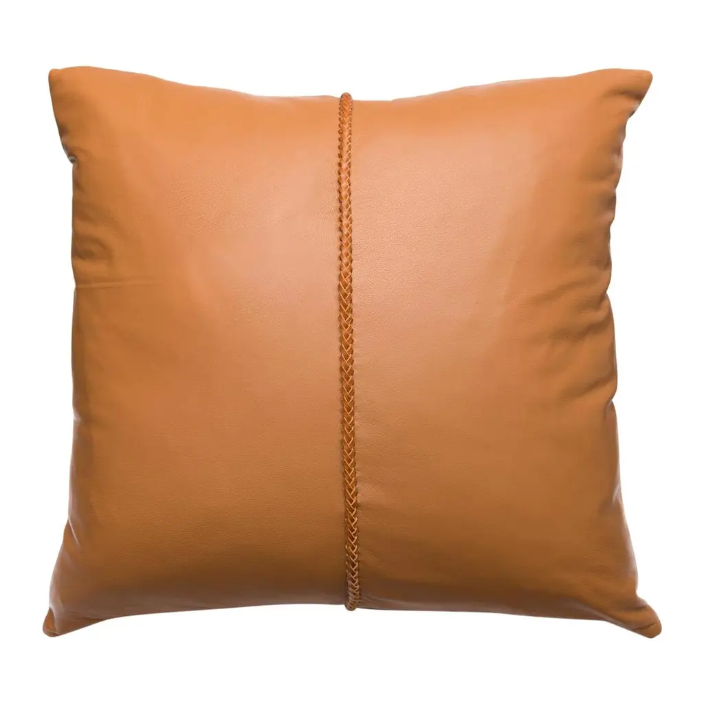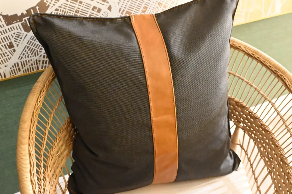 Make a bold yet refined statement with this modern accent pillow, designed to marry texture, warmth, and versatility. Wrapped in smooth jet-black upholstery with a subtly woven finish, the pillow features a rich chestnut leather stripe running vertically—adding a hint of rugged sophistication to its sleek profile. Perfectly staged on a wicker chair, the pillow effortlessly bridges contemporary design with organic charm. Whether placed on a sofa, armchair, or bed, it’s the ideal piece to accent monochrome interiors or add contrast to earthy palettes.