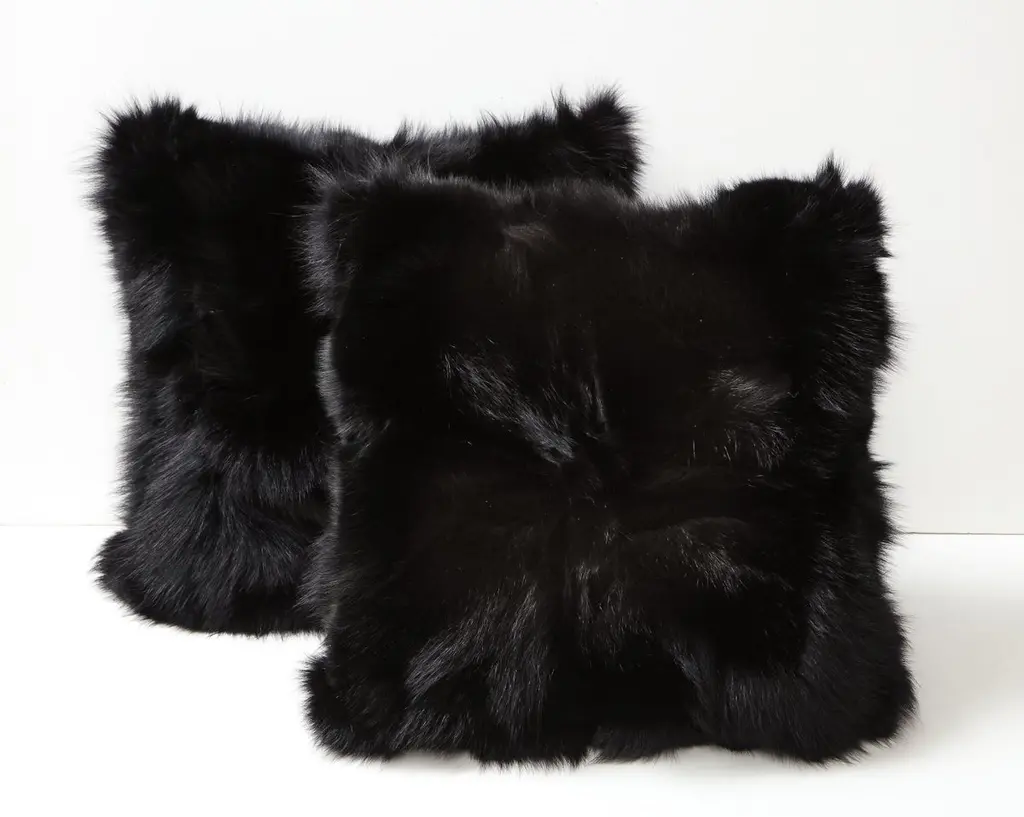 Beautiful double sided long hair Toscana shearling pillow in black color. Very elegant in look and tangibly luxurious and soft. It is made of genuine shearing with a zipper enclosure in a matching color, filled with down and feather, and 18" square in size. Custom orders are also available for different sizes.