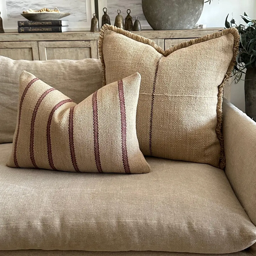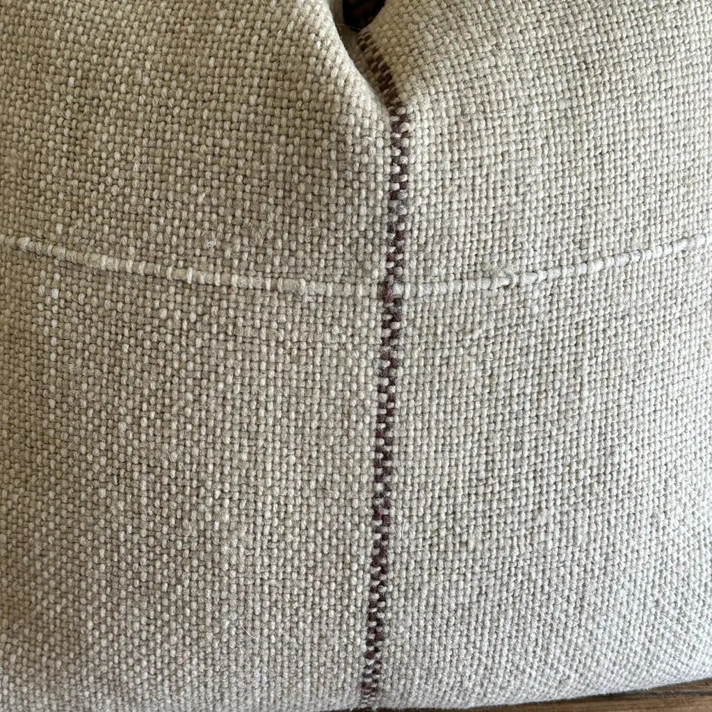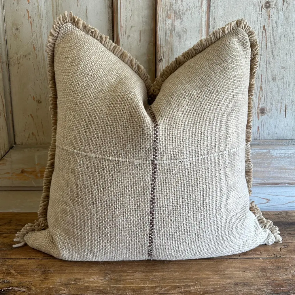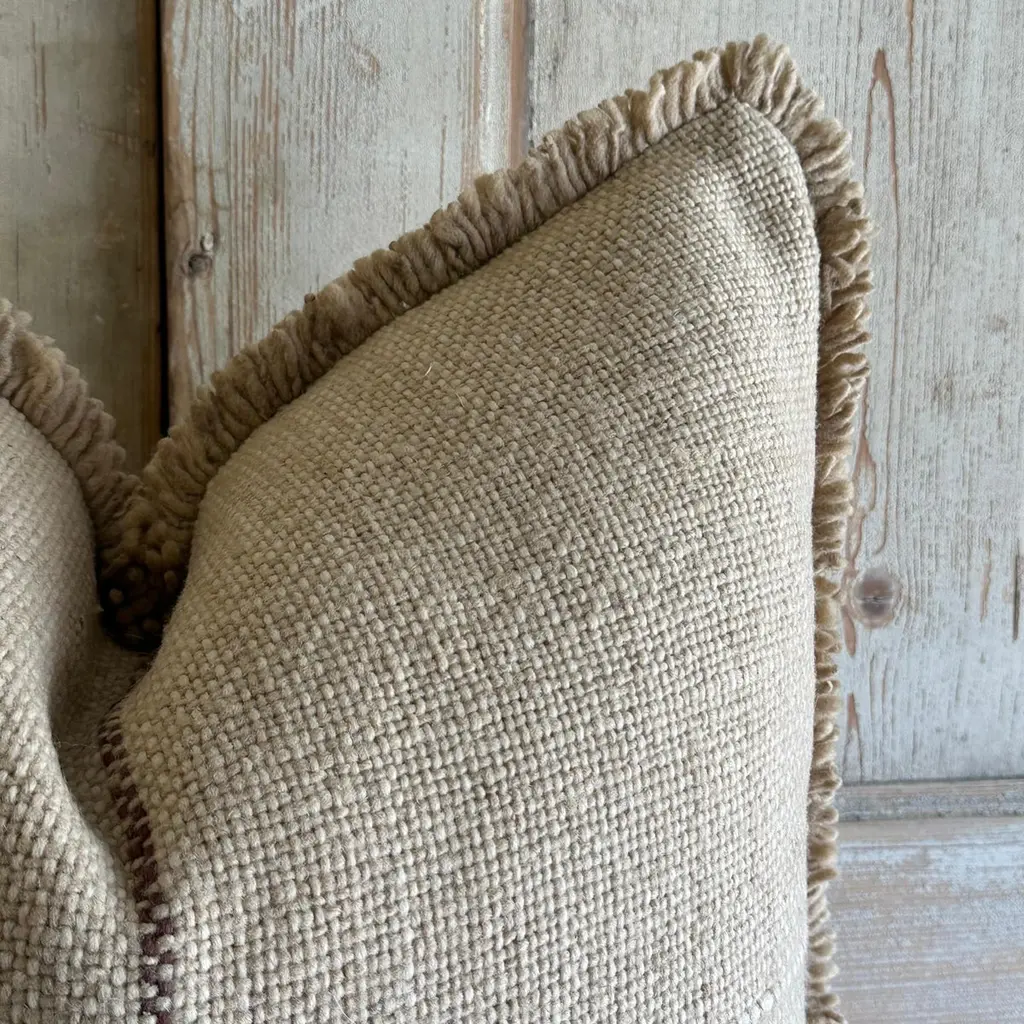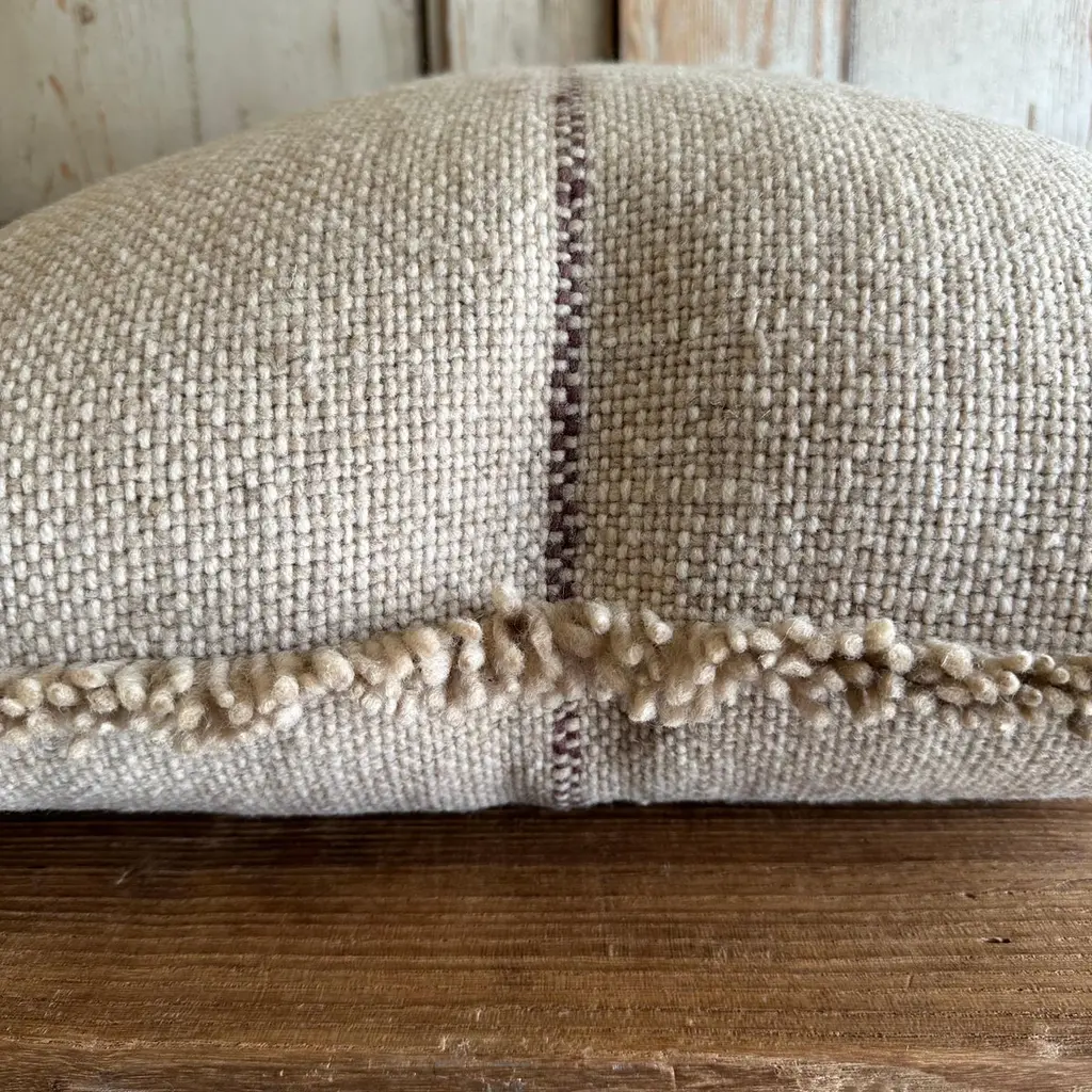 Wool Alpaca accent pillow from . A beautiful natural pillow with brown stripe and fringe. Large wood yarns woven to create a beautiful texture. Hidden zipper closure. Due to the unique yarns, the color varies which are normal and to be expected. If this item is backordered please allow 6-8 weeks for production.The textiles are made with 100% wool from ’Chilota’ sheep, that are born and raised on the island. The process by which these luxurious wool pieces are made starts with shearing the sheep, cleaning the wool in hot water to remove the natural oils of the sheep, drying and spinning the wool into fine threads before hand weaving into unique textile patterns and textures. The textiles we use are colored by natural dyes using leaves, barks, roots, branches or mineral elements. Their main characteristic is their capacity to adapt to difficult weather conditions which makes their wool resistant, flexible and durable.Color of yarn varies, can appear lighter or darker Includes down/feather insert.Size: 24" x 24".
