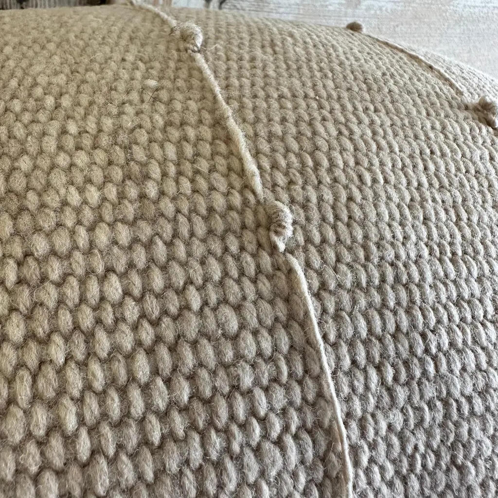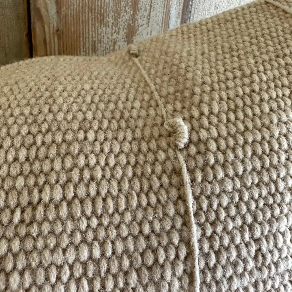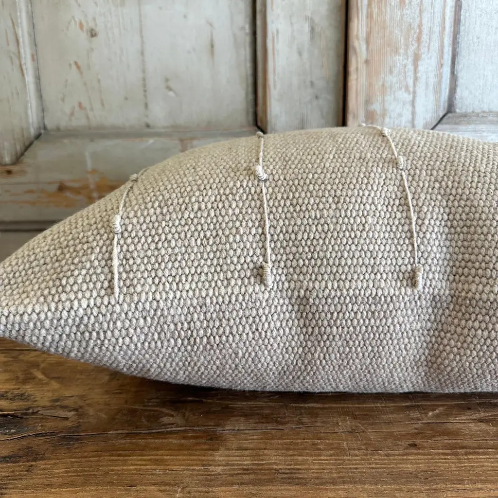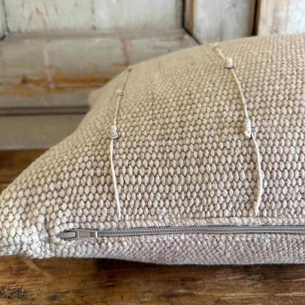 Wool Alpaca accent pillow from . A beautiful natural oatmeal pillow with stripes. Large wood yarns woven to create a beautiful texture. Hidden zipper closure. Due to the unique yarns, the color varies which are normal and to be expected. If this item is backordered please allow 6-8 weeks for production.The textiles are made with 100% wool from ’Chilota’ sheep, that are born and raised on the island. The process by which these luxurious wool pieces are made starts with shearing the sheep, cleaning the wool in hot water to remove the natural oils of the sheep, drying and spinning the wool into fine threads before hand weaving into unique textile patterns and textures. The textiles we use are colored by natural dyes using leaves, barks, roots, branches or mineral elements. Their main characteristic is their capacity to adapt to difficult weather conditions which makes their wool resistant, flexible and durable.Color of yarn varies, can appear lighter or darkerIncludes down/feather insert.Size: 15" x 24"